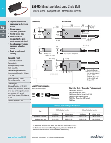 46Dimensions in millimeters (inch) unless otherwise statedACTUAL SIZEØ 4.3 (0.17) thru17.5(0.70)17.5(0.70)37.5(1.50)15.5 (0.61) 2.8 (0.11)2.8 (0.11)27(1.06)7.8 (0.31) 7.8 (0.31) 7mm (0.30) travel 7mm (0.30) travel 10 (0.4)10 (0.4)5.25 (0.21) 5 (0.2)13.5 (0.53) 12 (0.50)Mechanical Override Ball End Cable Connector(Will accept ø1.6 ± 0.15 (0.063 ± 0.006) cable with ø4.78 ± 0.13 (0.188 ± 0.005) ball)See page 272.73.5(2.90)145 (5.7) Max Travel 8 (.32)18.6(0.73)7.3 (0.30)REFWire Color Code / Connector Pin Assignment:PIN 1: Brown: Ground (-)PIN 2: Red: Power 8 to 26 VDCPIN 3: Orange: Control Signal 8 to 26 VDCPIN 4: Black: Microswitch CommonPIN 5: Blue: Microswitch N.O. ContactPIN 6: None11 2 3PIN 3PIN 2PIN 1PIN 1 IndicatorPIN 6PIN 5PIN 4• Simple transition from mechanical to electronic access• Microprocessor controlled gear motor• Minimal power draw• Optional internal microswitch for latch open/close output signal• Accepts signals from any electronic actuation source• Single or multi-point latchingMaterial & FinishEnclosure & Latch Bolt: ThermoplasticHousing Assembly Screws: Steel, zinc platedElectrical Specifi cationsRecommended Operating Voltage:12-24 VDCTypical Operating Current: Less than 600mA at 12 VDCControl InputRetracted Position: 12-24 VDCThe latch bolt will remain retracted for as long as the signal is present or a minimum of 1 second.Input Signal Current: 25mA Max at 24 VDCExtended Position: 0 VDC* For Mechanical Version of Front Mount Style order part number EM-05-11-001* For Mechanical Version of Side Mount Style order part number EM-05-21-001(Mechanical version does not include drive motor or electronics)EM-05 Miniature Electronic Slide Bolt Push-to-close · Compact size · Mechanical overrideMiniature Electronic Keeper Part NumbersTypeWith Mechanical Override Without Mechanical OverrideWith Switch Without Switch With Switch Without SwitchFront Mount Latch Bolt EM-05-11-111 EM-05-11-101* EM-05-11-110 EM-05-11-100Side Mount Latch Bolt EM-05-21-111 EM-05-21-101* EM-05-21-110 EM-05-21-100Latch Wiring ConnectionMolex Microfi t 3.0 seriesSide Mount Front Mount12V24Vwww.southco.com/EM-05Overgeared (Team Argo)