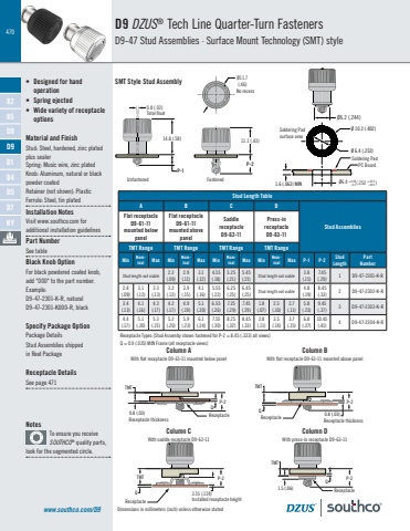 470Dimensions in millimeters (inch) unless otherwise statedStud Length TableA B C DStud AssembliesFlat receptacle D9-61-11mounted below panelFlat receptacle D9-61-11mounted above panelSaddle receptacle D9-62-11Press-in receptacle D9-63-11TMT Range TMT Range TMT Range TMT RangeMin Nominal Max Min Nominal Max Min Nominal Max Min Nominal Max P-1 P-2 Stud LengthPart NumberStud length not viable 2.2(.09)2.9(.11)3.1(.12)4.55(.18)5.25(.21)5.45(.21) Stud length not viable 3.8(.15)7.45(.29) 1 D9-47-2301-K-R2.4(.09)3.1(.12)3.3(.13)3.2(.13)3.9(.15)4.1(.16)5.55(.22)6.25(.25)6.45(.25) Stud length not viable 4.8(.19)8.45(.33) 2 D9-47-2302-K-R3.4(.13)4.1(.16)4.3(.17)4.2(.17)4.9(.19)5.1(.20)6.55(.26)7.25(.29)7.45(.29)1.8(.07)2.5(.10)2.7(.11)5.8(.23)9.45(.37) 3 D9-47-2303-K-R4.4(.17)5.1(.20)5.3(.21)5.2(.20)5.9(.23)6.1(.24)7.55(.30)8.25(.32)8.45(.33)2.8(.11)3.5(.14)3.7(.15)6.8(.27)10.45(.41) 4 D9-47-2304-K-R1.6 (.063) MIN Ø 10.2 (.402)Ø 6.4 (.252)Ø6.4 +0.08-0.0+.003 (.252 -.000 )D9 DZUS® Tech Line Quarter-Turn FastenersD9-47 Stud Assemblies · Surface Mount Technology (SMT) stylewww.southco.com/D9• Designed for hand operation• Spring ejected• Wide variety of receptacle optionsMaterial and FinishStud: Steel, hardened, zinc plated plus sealerSpring: Music wire, zinc platedKnob: Aluminum, natural or black powder coatedRetainer (not shown): PlasticFerrule: Steel, tin platedInstallation NotesVisit www.southco.com for additional installation guidelinesPart NumberSee tableBlack Knob OptionFor black powdered coated knob, add \Example:D9-47-2301-K-R, naturalD9-47-2301-K000-R, blackSpecify Package OptionPackage DetailsStud Assemblies shippedin Reel PackageReceptacle DetailsSee page 471NotesTo ensure you receive SOUTHCO® quality parts, look for the segmented circle.SMT Style Stud Assembly14.8 (.58)0.8 (.03) 11.1 (.43)P-1P-2Q QQQ 1.5 (.06)0.8 (.03) 0.8 (.03) TMT TMTTMTTMTP-2P-2 P-2P-2Column AWith flat receptacle D9-61-11 mounted below panelWith saddle receptacle D9-62-11Receptacle Receptacle thickness Receptacle thickness ReceptacleReceptacleWith flat receptacle D9-61-11 mounted above panelWith press-in receptacle D9-63-11Column BColumn C Column DØ6.3 (.25)Ø11.7(.46)A Min = 0.9 (.035)A Max = See TableØ6.4 +0.03-0.05+.001 (.252 -.002 )No recessUnfastenedReceptacle Types (Stud Assemby shown fastened for P-2 = 8.45 (.333) all views)Q = 0.9 (.035) MIN Frame (all receptacle views)Total floatFastenedSoldering PadSoldering Pad surface areaPC BoardØ6.2 (.244)Ø11.7(.46)Installed receptacle height Receptacle3.15 (.124)8285D8D9D1D4D5D7NY