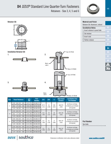 481Dimensions in millimeters (inch) unless otherwise stated www.southco.com/D4Material and FinishRetainer GA: Aluminum, naturalInstallation Notes1. Insert retainer in panel hole2. Set retainer3. Insert stud4. Flatten retainerD4 DZUS® Standard Line Quarter-Turn FastenersRetainers · Size 3, 4, 5 and 6Retainer GAwww.southco.com/D4Ø ACØ BLPart NumberSee tableTool: 29-TP1AXBlock: 29-TB2AXBlockside ATool: 29-TP3AXBlock: 29-TB1AXBlockside CInstallation Retainer GA1. 2.3. 4.Ø ACØ BLSize Panel Thickness L Part Number Ø A Ø B C Adjustment FormulaInstallation Tool Part Number30.38 - 0.64 (.015 - .025) 4.45 (.175) D4-GA3-175Ø 7.9 (.311)5.6 (.220)0.38 (.015)Add 0.76 (.030)29-TP1A3, 29-TP3A3,29-TB1A3 and 29-TB2A3 (all required)0.66 - 1.27 (.026 - .050) 5.08 (.200) D4-GA3-2001.29 - 2.38 (.051 - .094) 6.35 (.250) D4-GA3-25040.38 - 0.64 (.015 - .025) 4.45 (.175) D4-GA4-17510.3 (.405)7.9 (.311).64 (.025)Add 1.28 (.050)29-TP1A4, 29-TP3A4,29-TB1A4 and 29-TB2A4 (all required)0.66 - 1.27 (.026 - .050) 5.08 (.200) D4-GA4-2001.29 - 2.38 (.051 - .094) 6.35 (.250) D4-GA4-25050.38 - 0.64 (.015 - .025) 4.45 (.175) D4-GA5-17512.7 (.500)9.5 (.374).71 (.028)Add 1.42 (.056)29-TP1A5, 29-TP3A5,29-TB1A5 and 29-TB2A5 (all required)0.66 - 1.27 (.026 - .050) 5.08 (.200) D4-GA5-2001.29 - 2.38 (.051 - .094) 6.35 (.250) D4-GA5-25060.38 - 0.64 (.015 - .025) 4.45 (.175) D4-GA6-17515.1 (.594)11.1 (.437).71 (.028)Add 1.42 (.056)29-TP1A6, 29-TP3A6,29-TB1A6 and 29-TB2A6 (all required)0.66 - 1.27 (.026 - .050) 5.08 (.200) D4-GA6-2001.29 - 2.38 (.051 - .094) 6.35 (.250) D4-GA6-250D1D4D5D7NY82D8D985