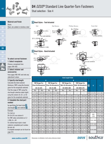 482Dimensions in millimeters (inch) unless otherwise statedACTUAL SIZEACTUAL SIZEACTUAL SIZED4 DZUS® Standard Line Quarter-Turn FastenersStud selection · Size 4Stud Length TableA BK U LTMT Range For: Rivet-On ReceptacleD4-S4-225TMT Range For: Rivet-On ReceptacleD4-S4-200TMT Range For: Weld-On ReceptacleD4-X485-300TMT Range For: Weld-On ReceptacleD4-X485-275Min. Max. Min. Max. Min. Max. Min. Max.1.27 (.050) 1.88 (.074) 1.91 (.075) 2.51 (.099) ~ ~ ~ ~ 25 1.91 (.075) 6.35 (.250)2.54 (.100) 3.15 (.124) 3.18 (.125) 3.78 (.149) 0.64 (.025) 1.24 (.049) 1.27 (.050) 1.88 (.074) 30 2.54 (.100) 7.62 (.300)3.81 (.150) 4.42 (.174) 4.45 (.175) 5.05 (.199) 1.91 (.075) 2.51 (.099) 2.54 (.100) 3.15 (.124) 35 3.81 (.150) 8.89 (.350)5.08 (.200) 5.69 (.224) 5.72 (.225) 6.32 (.249) 3.18 (.125) 3.78 (.149) 3.81 (.150) 4.42 (.174) 40 5.08 (.200) 10.16 (.400)6.35 (.250) 6.96 (.274) 6.99 (.275) 7.59 (.299) 4.45 (.175) 5.05 (.199) 5.08 (.200) 5.69 (.224) 45 5.72 (.225) 11.43 (.450)7.62 (.300) 8.23 (.324) 8.26 (.325) 8.86 (.349) 5.72 (.225) 6.32 (.249) 6.35 (.250) 6.96 (.274) 50 6.35 (.250) 12.70 (.500)8.89 (.350) 9.50 (.374) 9.53 (.375) 10.13 (.399) 6.99 (.275) 7.59 (.299) 7.62 (.300) 8.23 (.324) 55 6.99 (.275) 13.97 (.550)10.16 (.400) 10.77 (.424) 10.80 (.425) 11.40 (.449) 8.26 (.325) 8.86 (.349) 8.89 (.350) 9.50 (.374) 60 7.62 (.300) 15.24 (.600)11.43 (.450) 12.04 (.474) 12.07 (.475) 12.67 (.499) 9.53 (.375) 10.13 (.399) 10.16 (.400) 10.77 (.424) 65 8.89 (.350)16.51 (.650)12.70 (.500) 13.31 (.524) 13.34 (.525) 13.94 (.549) 10.80 (.425) 11.40 (.449) 11.43 (.450) 12.04 (.474) 70 17.78 (.700)13.97 (.550) 14.58 (.574) 14.61 (.575) 15.21 (.599) 12.07 (.475) 12.67 (.499) 12.70 (.500) 13.31 (.524) 7510.16 (.400)19.05 (.750)15.24 (.600) 15.85 (.624) 15.88 (.625) 16.48 (.649) 13.34 (.525) 13.94 (.549) 13.97 (.550) 14.58 (.574) 80 20.32 (.800)16.51 (.650) 17.12 (.674) 17.15 (.675) 17.75 (.699) 14.61 (.575) 15.21 (.599) 15.24 (.600) 15.85 (.624) 85 12.70 (.500) 21.59 (.850)17.78 (.700) 18.39 (.724) 18.42 (.725) 19.02 (.749) 15.88 (.625) 16.48 (.649) 16.51 (.650) 17.12 (.674) 9015.24 (.600)22.86 (.900)19.05 (.750) 19.66 (.774) 19.69 (.775) 20.29 (.799) 17.15 (.675) 17.75 (.699) 17.78 (.700) 18.39 (.724) 95 24.13 (.950)20.32 (.800) 20.93 (.824) 20.96 (.825) 21.56 (.849) 18.42 (.725) 19.02 (.749) 19.05 (.750) 19.66 (.774) 100 25.40 (1.00)www.southco.com/D428º Cam seat centerlineU L1.3 (.051)Ø 5.1 (.201)2.54(.100) Ø 6.3 (.248)1.7 (.067)Ø 11.1(.437)22.2 (.874) 8.2(.323)U L28ºCam seat centerlineØ 11.1(.437)2.3U (.091)No. 2 PhillipsØ 11.1 (.437)L3/32 Hex1.6(.063) U LØ 11.1 (.437)H Head Styles - Tool ActuatedSlot Hex Recess Phillips RecessH Head Styles - Hand ActuatedBailFlush SlotWingØ 11.1(.437)1.3 (.051)U L28ºCam seat centerlineØ 11.1 (.437)3.9 (.154) 18.9 (.744)23(.906)U1.3 (.051)L28ºCam seat centerlineMaterial and FinishStuds: Steel, zinc plated or stainless steel To select correct fastener:1. Select receptacleChoose a receptacle from pages 484-4852. Select retainer and accessoriesfrom pages 480-481 and note any adjustment values3. Specify stud lengthCalculate the total material thickness (TMT) using the formula given for the receptacle selected.Find the range of TMT using the stud length selection table (right) using the column (A, B, C, or D) given for the receptacle selected.4. Complete the stud part numberby specifying the head style H , stud length K , and material MExample: For rivet-on D4-S4-225 use column AFor TMT value calculated as 5.2 (.206), K = 40For slotted head style in steel material, completed part number: D4-AJ4-40A complete example can be found on page 435ACTUAL SIZE ACTUAL SIZE ACTUAL SIZE8285D8D9D1D4D5D7NY