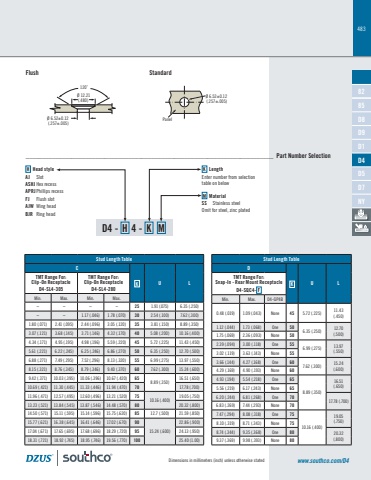 483Dimensions in millimeters (inch) unless otherwise statedStud Length TableCK U LTMT Range For: Clip-On ReceptacleD4-SL4-305TMT Range For: Clip-On ReceptacleD4-SL4-280Min. Max. Min. Max.~ ~ ~ ~ 25 1.91 (.075) 6.35 (.250)~ ~ 1.17 (.046) 1.78 (.070) 30 2.54 (.100) 7.62 (.300)1.80 (.071) 2.41 (.095) 2.44 (.096) 3.05 (.120) 35 3.81 (.150) 8.89 (.350)3.07 (.121) 3.68 (.145) 3.71 (.146) 4.32 (.170) 40 5.08 (.200) 10.16 (.400)4.34 (.171) 4.95 (.195) 4.98 (.196) 5.59 (.220) 45 5.72 (.225) 11.43 (.450)5.61 (.221) 6.22 (.245) 6.25 (.246) 6.86 (.270) 50 6.35 (.250) 12.70 (.500)6.88 (.271) 7.49 (.295) 7.52 (.296) 8.13 (.320) 55 6.99 (.275) 13.97 (.550)8.15 (.321) 8.76 (.345) 8.79 (.346) 9.40 (.370) 60 7.62 (.300) 15.24 (.600)9.42 (.371) 10.03 (.395) 10.06 (.396) 10.67 (.420) 658.89 (.350)16.51 (.650)10.69 (.421) 11.30 (.445) 11.33 (.446) 11.94 (.470) 70 17.78 (.700)11.96 (.471) 12.57 (.495) 12.60 (.496) 13.21 (.520) 7510.16 (.400)19.05 (.750)13.23 (.521) 13.84 (.545) 13.87 (.546) 14.48 (.570) 80 20.32 (.800)14.50 (.571) 15.11 (.595) 15.14 (.596) 15.75 (.620) 85 12.7 (.500) 21.59 (.850)15.77 (.621) 16.38 (.645) 16.41 (.646) 17.02 (.670) 9015.24 (.600)22.86 (.900)17.04 (.671) 17.65 (.695) 17.68 (.696) 18.29 (.720) 95 24.13 (.950)18.31 (.721) 18.92 (.745) 18.95 (.746) 19.56 (.770) 100 25.40 (1.00)Stud Length TableDK U LTMT Range For: Snap-In - Rear Mount ReceptacleD4-SQC4- FMin. Max. D4-GP4B0.48 (.019) 1.09 (.043) None 45 5.72 (.225) 11.43 (.450)1.12 (.044) 1.73 (.068) One 506.35 (.250) 12.70 (.500) 1.75 (.069) 2.36 (.093) None 502.39 (.094) 3.00 (.118) One 556.99 (.275) 13.97 (.550) 3.02 (.119) 3.63 (.143) None 553.66 (.144) 4.27 (.168) One 607.62 (.300) 15.24 (.600) 4.29 (.169) 4.90 (.193) None 604.93 (.194) 5.54 (.218) One 658.89 (.350)16.51 (.650) 5.56 (.219) 6.17 (.243) None 656.20 (.244) 6.81 (.268) One 7017.78 (.700)6.83 (.269) 7.44 (.293) None 707.47 (.294) 8.08 (.318) One 7510.16 (.400)19.05 (.750) 8.10 (.319) 8.71 (.343) None 758.74 (.344) 9.35 (.368) One 80 20.32 (.800) 9.37 (.369) 9.98 (.393) None 80www.southco.com/D4D4 - H 4 - K MK LengthEnter number from selection table on belowH Head styleAJ SlotASHJ Hex recessAPRJ Phillips recessFJ Flush slotAJW Wing headBJR Ring headM MaterialSS Stainless steelOmit for steel, zinc platedPanelØ 6.52±0.12 (.257±.005)Ø 12.21 (.480) 120˚ 120˚ Ø 12.21(.480) Ø 6.52±0.12 (.257±.005)___________________________________________________________________________ Part Number SelectionFlush StandardD1D4D5D7NY82D8D985