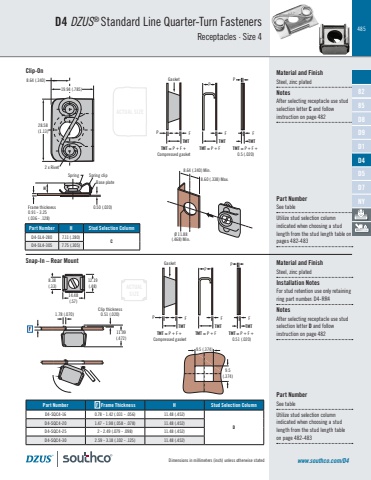 485Dimensions in millimeters (inch) unless otherwise statedACTUAL SIZEACTUALSIZED4 DZUS® Standard Line Quarter-Turn FastenersReceptacles · Size 4Material and FinishSteel, zinc platedNotesAfter selecting receptacle use studselection letter C and follow instruction on page 482Clip-On Part Number H Stud Selection ColumnD4-SL4-280 7.11 (.280)CD4-SL4-305 7.75 (.305)8.60 (.338) Max.8.64 (.340) Min.Ø 11.88(.468) Min.2 x Rivet28.58 (1.13)Frame thickness0.91 - 3.25(.036 - .128)0.50 (.020)SpringHSpring clipBase plate 19.94 (.785)8.64 (.340)www.southco.com/D4Part NumberSee tableUtilize stud selection column indicated when choosing a stud length from the stud length table on pages 482-483Material and FinishSteel, zinc platedInstallation NotesFor stud retention use only retaining ring part number: D4-RR4NotesAfter selecting receptacle use studselection letter D and follow instruction on page 482Snap-In – Rear Mount TMT = P + F + 0.51 (.020)F F FPPPTMT TMTTMT = P + F + Compressed gasketGasketTMT = P + F TMTPart Number F Frame Thickness H Stud Selection ColumnD4-SQC4-16 0.78 - 1.42 (.031 - .056) 11.48 (.452)DD4-SQC4-20 1.47 - 1.98 (.058 - .078) 11.48 (.452)D4-SQC4-25 2 - 2.49 (.079 - .098) 11.48 (.452)D4-SQC4-30 2.59 - 3.18 (.102 - .125) 11.48 (.452)9.5(.374)9.5 (.374)Part NumberSee tableUtilize stud selection column indicated when choosing a stud length from the stud length table on page 482-4838.38(.33)12.19(.48)14.48(.57)1.78 (.070)11.99(.472)Clip thickness0.51 (.020)FTMT = P + F + 0.5 (.020)F F FPPPTMT TMTTMT = P + F + Compressed gasketGasketTMT = P + F TMTD1D4D5D7NY82D8D985