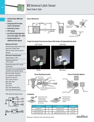 47ADimensions in millimeters (inch) unless otherwise statedES Universal Latch SensorReed Switch Style• Indicates Door AND latch Secure• Integrated LED Provides Interior Illumination• Contactless Sensor• IP67 Sealed• Use With E5 Adjustable Grip Cam Latch (pages 153-153A)• Contact Southco for additional latch optionsMaterial and FinishSwitch Housing: Polycarbonate, ClearBack Plate: PC/ABS, BlackAdhesive: Acrylic foam and acrylic adhesive Electronic SpecificationsSupply Voltage: 12 VDCOperating Temperature:-40°C to 80°COperating Humidity: 85% max No condensationVisit southco.com to download further installation and operation detailsWire Color Code / ConnectorPin Assignments (Single PoleDouble Throw Version)PIN 1: Brown: Ground (-)PIN 2: Red: Power PIN 3: NonePIN 4: NonePIN 5: Blue: Normally OpenPIN 6: Gray: Normally ClosedSensor DimensionsSingle Pole Double Throw Version Shown With Southco E5 Adjustable Grip LatchLatch ClosedSPDT (Single Pole Double Throw)SecureBrownULSNCNOC BlueGrayRed LEDs 12VDCLatch OpenNot SecureInstallationAttach base to frame utilizing pressure sensitive adhesive. Optionally install M3 or #4-40 screw.Snap housing onto base with arrow pointed to magnet location.70 ±5+4-0Sensor Mounting LocationDoorE5-6 LatchSee page 153E5-400X-XXX Magnetic Sensor Cam. See page 153AFrame16(.63)25(.98)150(5.91)20(.79)25(.98)Single Pole Double Throw VersionPIN 5PIN 1 PIN 2PIN 6Normally Open Version2x Black WireSwitch Type Integrated LED Connector Type Part NumberNormally Open No Stripped And Tinned ES-01-0200Single Pole Double Throw Yes Stripped And Tinned ES-01-0100Single Pole Double Throw Yes Molex Microfit 3.0 Series 6 Pin ES-01-0121Black BlackNormally OpenULSCommonSensor Orientation OptionsLatchSensor Sensor CamSensor