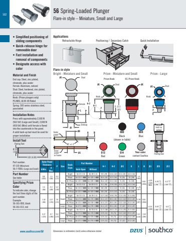 502www.southco.com/56 Dimensions in millimeters (inch) unless otherwise stated56 Spring-Loaded PlungerFlare-in style – Miniature, Small and LargeACTUAL SIZE• Simplified positioning ofsliding components• Quick-release hinge for removable door• Fast installation and removal of components• Designate access with colorMaterial and FinishEnd cap: Steel, zinc plated, chromate, plus sealerFerrule: Aluminum, naturalStud: Steel, hardened, zinc plated, chromate, plus sealerKnob: (Prism plungers only) PC/ABS, UL94-V0 Rated Spring: 300 series stainless steel, passivatedInstallation NotesPress with approximately 2,500 N (562 lbf) (Large and Small), 2,000 N (450 lbf) (Mini) until ferrule is flared into the countersink in the panel. A solid back-up tool must be used for proper installationInstall ToolPart number: 47-110 (Miniature)56-7-TOOL (Large and Small)Part NumberSee table Specifying Prism ColorTo indicate color, change the last three digits of the part number. Example:56-161-000, black56-161-013, redØEL 22.2(.87) PH-1ØE008Blue013Red000Black(shown in table)014GreenYour colorcontact SouthcoBright - Miniature and Small Prism - Miniature and SmallPrism Knob 4C-Prism KnobKnobStudSmoothback-upsurfaceFlaring toolFlaring Tool90˚ Ø 13(.50)102 (4.00)ApplicationsRetractable Hinge Positioning / Secondary Catch Quick InstallationFlare-in stylePrism - LargeOuter Panel Thickness P Size Knob StylePart NumberH-1 H-2 Ø E K L B Ø J Ø D Ø CA Min. A Max. Hold-Open Without0.8(.031)1.5 (.06)4.4 (.17) MiniBright 56-21-1-15 56-20-1-15 9.9 (.39) 13.6 (.54) 8.5 (.33) 14.3 (.56)1.0 (.04)0.41 (.016)4.29 (.169) MAX6.76+0.1- 0.0 (.266+.004- .000 )4.3+0.13- 0.0(.169+.005- .000 )Prism 56-121-1-000 56-120-1-000 10.6 (.42) 14.3 (.56) 9 (.35) 15 (.59)4C-Prism 56-321-1-000 56-320-1-000 10.6 (.42) 14.3 (.56) 9 (.35) 15 (.59)1.5 (.06)2.3 (.09)5.2 (.20)Bright 56-21-2-15 56-20-2-15 9.1 (.36) 12.8 (.50) 8.5 (.33) 14.3 (.56)1.78 (.07) Prism 56-121-2-000 56-120-2-000 9.8 (.39) 13.5 (.53) 9 (.35) 15 (.59)4C-Prism 56-321-2-000 56-320-2-000 9.8 (.39) 13.5 (.53) 9 (.35) 15 (.59)1.52(.06)3.17(.125)7.9 (.31)SmallBright 56-71-1-15 56-70-1-15 13.7 (.54) 19.8 (.78) 11.5 (.45) 21.5 (.85)1.78 (.07)0.41 (.016)6.33 (.249)9.19+0.08- 0.0(.362+.003- .000 ) 6.4+0.1- 0.0(.250+.005- .000 )Prism 56-171-1-000 56-170-1-000 14.5 (.57) 20.5 (.81) 13.3 (.52) 22.2 (.87)4C-Prism 56-371-1-000 56-370-1-000 14.5 (.57) 20.5 (.81) 13.3 (.52) 22.2 (.87)Large Prism 56-271-1-000 56-270-1-000 14.5 (.57) 20.5 (.81) 17 (.67) 22.2 (.87)3.17(.125)4.7(.185)9.4 (.37)SmallBright 56-71-2-15 56-70-2-15 12.2 (.48) 18.2 (.72) 11.5 (.45) 21.5 (.85)3.3 (.13)1.52 (.06)Prism 56-171-2-000 56-170-2-000 12.9 (.51) 19 (.75) 13.3 (.52) 22.2 (.87)4C-Prism 56-371-2-000 56-370-2-000 12.9 (.51) 19 (.75) 13.3 (.52) 22.2 (.87)Large Prism 56-271-2-000 56-270-2-000 12.9 (.51) 19 (.75) 17 (.67) 22.2 (.87)KØJL PH-2ØEA BØCØD90˚ +/- 2˚StudFerruleEndcapOuterpanelInnerpanelor frameKnobStudLPØE