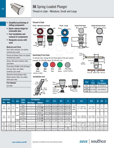 504Dimensions in millimeters (inch) unless otherwise stated56 Spring-Loaded PlungerThread-in style - Miniature, Small and Largewww.southco.com/56ACTUAL SIZE• Simplified positioning of sliding components• Quick-release hinge for removable door• Fast installation and removal of components• Designate access with colorMaterial and FinishStud: Steel, hardened, zinc plated, chromate plus sealerFerrule and Sleeve: Steel, zinc plated, chromate plus sealerSpring: 300 series stainless steelpassivatedPrism Knob: PC/ABS, UL94-V0 RatedEnd cap: Steel, zinc plated, chromate, plus sealer(Aluminum knob plungers only) Detent washer: Steel, zinc plated(Hold-open only)Size X(Tool)Tool Part NumberMini 7.1 (.28) 56-0-22041-03 Small9.5 (.38) 56-0-22041-04 Large0.8 (.03)both sizesKnobassemblySleevetighten withopen-endwrench36.5(1.44)13(.50)130(5.13)29(1.13)XOuter PanelP Size Knob StylePart Number H-1 H-2 Ø E K Ø J Ø C Ø D M Ø R SMin. Max. Hold-Open Without0.8(.031)1.5(.06)4.4(.17) MiniBright — 56-30-15 9.2 (.36) 12.9 (.51) 8.5 (.335) 13.6 (.54) 4.29 (.169) MAX4.3 +0.08/-0.0 (.17 +.003 -.000)7.14 ±0.08(.281 ±.003)5.1 (.20)9 (.35)7 (.28) Prism — 56-130-000 9.9 (.39) 13.6 (.54) 9 (.354) 14.3 (.56)4C-Prism — 56-330-000 9.9 (.39) 13.6 (.54) 10 (.354) 14.3 (.56)0.8(.031)3.2(.13)6.9(.27)SmallBright — 56-80-15 12.2 (.48) 20.4 (.80) 11.5 (.45) 20.3 (.80)6.33 (.249)6.35 + 0.08/-0.0(.250 +.003/.000)9.12 ±0.08(.359 ± .003)7.1 (.28)11.1 (.44)9.4 (.37)Prism — 56-180-000 13 (.51) 21.1 (.83) 13.3 (.52) 21 (.83)4C-Prism — 56-380-000 13 (.51) 21.1 (.83) 13 (.51) 21 (.83)Large Prism — 56-280-000 14.1 (.56) 21.1 (.83) 17 (.67) 21 (.83)0.64(.025)1.5(.06)6.4(.17) Small Aluminum 56-10-301-20 56-99-196-20 13.4 (.53) 18.4 (.72) 13.5 (.53) 19.8 (.78) 4.7 (.183)4.78 +0.08/-0.03 (.17 +.003 -.000)7.14 ±0.08(.281 ±.003)5.6 (.20)9 (.35)7 (.28)0.8(.031)3.2(.13)7.9(.31) Large Aluminum 56-10-401-20 56-99-197-20 18.3 (.72) 24.6 (.97) 17.5 (.69) 26.2 (1.03)6.2 (.245)6.35 + 0.08/-0.08(.250 +.003/.000)9 .12 ±0.08(.359 ±.003)7.1 (.28)11.1 (.44)9.4 (.37)Specifying Prism ColorTo indicate color, change the last three digits of the part number.Example: 56-130-000, black; 56-130-013, redInstallation toolPart NumberSee tableThread-in StylePrism - Miniature and Small Prism - Large Bright Steel Knob Bright Aluminum Knob000Black(shown in table)008Blue013Red014GreenYour colorcontact SouthcoH-2KPØJØE ØE ØEØJØMH-1PØEOuterpanelPanelthicknessSleeveFrame Hole prepØ RSØ DMØ CKnobStudKnobStudStud KnobEndcapFerruleØEEndcap