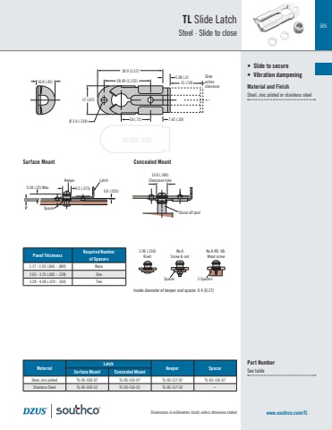 505Dimensions in millimeters (inch) unless otherwise statedACTUAL SIZETL Slide LatchSteel · Slide to close• Slide to secure • Vibration dampeningMaterial and FinishSteel, zinc plated or stainless steelwww.southco.com/TL10.0 (.394)Clearance holeStand off post5.58 (.22) Max.P9.5 (.375) 0.6 (.025)Keeper LatchSpacerPart NumberSee table10.8 (.43)17 (.67)39.9 (1.57)28.49 (1.122) 5.08 (.2)Ø 3.4 (.134) 18 (.71)Slide action clearance7.62 (.30)15 (.59)Surface Mount Concealed MountMaterialLatchKeeper Spacer Surface Mount Concealed MountSteel, zinc plated TL-05-100-07 TL-05-110-07 TL-05-117-07 TL-05-114-07Stainless Steel TL-05-100-52 TL-05-110-52 TL-05-117-52 ~Panel Thickness Required Numberof Spacers1.17 - 2.03 (.046 - .080) None2.05 - 3.25 (.081 - .128) One3.28 - 4.06 (.129 - .160) Two3.96 (.156)RivetNo.8Screw & nutNo.8 RD. HD.Wood screwSpacer 2 SpacersInside diameter of keeper and spacer: 4.4 (0.17)