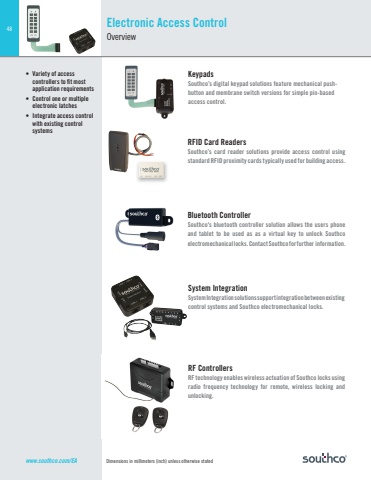 48Dimensions in millimeters (inch) unless otherwise statedRF ControllersRF technology enables wireless actuation of Southco locks using radio frequency technology for remote, wireless locking and unlocking.RFID Card ReadersSouthco’s card reader solutions provide access control using standard RFID proximity cards typically used for building access. Bluetooth ControllerSouthco's bluetooth controller solution allows the users phone and tablet to be used as as a virtual key to unlock Southco electromechanical locks. Contact Southco for further information. KeypadsSouthco’s digital keypad solutions feature mechanical pushbutton and membrane switch versions for simple pin-based access control.• Variety of access controllers to fi t most application requirements• Control one or multiple electronic latches• Integrate access control with existing control systemsSystem IntegrationSystem Integration solutions support integration between existing control systems and Southco electromechanical locks.Electronic Access ControlOverviewwww.southco.com/EA