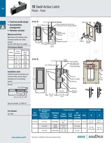 508Dimensions in millimeters (inch) unless otherwise statedPart NumberMax. Misalignment Between Centerlines of Panel Hole and Frame HoleFrame or Bracket Outer Panel / DoorRated Load (Short Term)Frame ThicknessJ±0.3 (.010)Ø K+0.5 (.020) -0.0 (.000) L Max. M N19-83-10 0.4 (.015) 180 N (40lbf) 3.2 (.13) Max. 6 (.234) 9.5 (.375) 11 (.45) 41.5 +0.4 -0.0 (1.64 +.005 -.0 )16.5 +0 -0.4(.640 +0 -.005 )19-93-100.6 (.025) 440 N (100lbf)Up to 3.2 (.13)8 (.312)13.5 (.531)15.(.56) 57.5±.02 (2.265±.005)20.5 +0.4 -0.0 (.812 +0 -.005) 0.8 (.030) 330 N (75lbf) 3.2 - 4.8 (.13 - .19) 14 (.56)ACTUALSIZEACTUALSIZE19 Swell Action LatchPlastic · Flush• Flush low profile design• Accommodates misalignment• Vibration resistantMaterial and FinishNylon black with stainless steel mounting bracket and rubber bushingSet tool: 1095 Steel, zinc platedPerformance DetailsInstallation notesPosition bracket and retainer over stud and strike set tool. Adjust mounting nut to set latching tension.Set toolTool part number: 17-10019-11Part NumberSee tablewww.southco.com/1951(2.00)102 (4.00)Ø 16 (.625)+.005 Ø 8.3 (.328 ) -.002 +0.2-0.044(1.73)19(.74) 21 (.84)(open) 23(.90)(open)21 (.81)(latched)3.2 (.13) Maximum9.5 (.37) Frame thicknessCupMounting bracketRetainerBushingNut 8-32 UNCScrewFrame or bracket outer surface of cup must contact frame or side mount bracketJØ KLMNDoororouterpanelFrameOuter panel / door NutRetainer Mountingbracket61(2.39)24 (.95)28 (1.12)(open)33 (1.30)(open)30 (1.16)(latched)4.8 (.19) Maximum13.3 (.52)FramethicknessCupMountingBracketRetainerBushingNut 12-24UNCScrewFrame or bracketouter surface of cup must contact frameor side mount bracket19-83-1019-93-10Series Frame thicknessRated load (short term)19-83-10 0.5 - 3.2 (.016 - .13)180 N (40lbf)19-93-100.5 - 3.2 (.016 - .13)440 N (100lbf)3.2 - 4.8 (.125 - .19)330 N (75lbf)