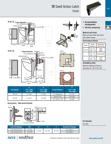 509Dimensions in millimeters (inch) unless otherwise statedACTUALSIZEACTUALSIZE19 Swell Action LatchPlastic• Accommodates misalignment • Vibration dampeningMaterial and FinishNylon and glass-filled nylon black with rubber bushing Performance DetailsInstallation notesMaximum tightening torque on mounting nut: 1 Nm (9 inlbf)www.southco.com/19Part NumberSee tableBushingNylon nut 8-32 UNCFrame28 (1.09)(open)8 (.31)(latched) 12(.47)3.2 (.13) MaximumFrame thickness15.5(.61)(open)4 (.14) 13 (.52)(latched)Door28(1.09)Handle and shaftassembly PinX RZØ S1.6(.06)9.5 (.38)16 (.63)31.8(1.25)2 holes,Ø 5.15 (.203 ) +0.1-0.0+.004-.000PanelFrameLatch Part Number Ø S R X Z Bracket Part Number19-81-10 and 19-83-10 9.5 (.38)27 (1.06) 20.5 (.81) 16.7 (.66)19-0-15666-1119-91-10 and 19-93-10 13.5 (.53) 19-0-15665-11Door orouter panelFrameØ KØ HGBushingNylonnutPart NumberG +0.1 (+.004)-0.0 (-.000)H +0.1 (+.004) -0.0 (-.000)Frame ThicknessK +0.5 (+.030) -0.0 (-.000)19-81-10 3.3 (.130) 4.1 (.161) 3.2 (.13) Maximum 9.5 (.375)19-91-10 4.5 (.177) 5.8 (.228) Up to 3.2 (.13) 13.5 (.531)3.2 - 4.8 (.13 - .19) 14 (.547)BushingNylon nut 12-24UNCFrame39 (1.53)(open)11.5 (.45)(latched)17 (.66)Frame thickness22.5 (.89)(open)5(.19)19 (.75)(latched)Door39(1.53)Handle and shaftAssembly Pin4.8 (.19) Maximum19-81-1019-91-10Accessories - Side mount bracketSeries Frame thicknessRated load (short term)19-81-10 0.5 - 3.2 (.016 - .13)180 N (40lbf)19-91-100.5 - 3.2 (.016 - .13) 440 N (100lbf)3.2 - 4.8 (.125 - .19)330 N (75lbf)