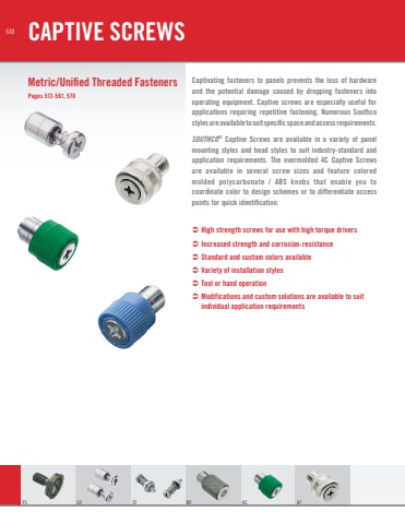 510 CAPTIVE SCREWSMetric/Unified Threaded FastenersPages 512-561, 570F5 52 5T N7 4C 47Captivating fasteners to panels prevents the loss of hardware and the potential damage caused by dropping fasteners into operating equipment. Captive screws are especially useful for applications requiring repetitive fastening. Numerous Southco styles are available to suit specific space and access requirements.SOUTHCO® Captive Screws are available in a variety of panel mounting styles and head styles to suit industry-standard and application requirements. The overmolded 4C Captive Screws are available in several screw sizes and feature colored molded polycarbonate / ABS knobs that enable you to coordinate color to design schemes or to differentiate access points for quick identification. High strength screws for use with high torque drivers Increased strength and corrosion-resistance Standard and custom colors available Variety of installation styles Tool or hand operation Modifications and custom solutions are available to suit individual application requirements