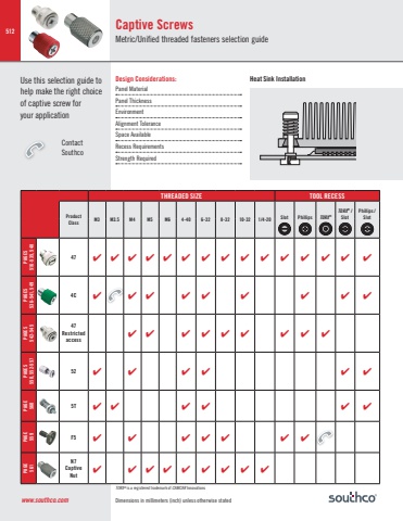 512Dimensions in millimeters (inch) unless otherwise stated512www.southco.comCaptive ScrewsMetric/Unified threaded fasteners selection guideUse this selection guide to help make the right choice of captive screw for your applicationContact SouthcoDesign Considerations:Panel MaterialPanel ThicknessEnvironmentAlignment ToleranceSpace AvailableRecess RequirementsStrength RequiredHeat Sink InstallationTHREADED SIZE TOOL RECESSProductClass M3 M3.5 M4 M5 M6 4-40 6-32 8-32 10-32 1/4-20 Slot Phillips TORX®TORX® / SlotPhillips /SlotPAGES516-535, 54847 PAGES536-541, 5494C PAGES542-54547 Restricted access PAGES550, 552-55752 PAGE 5605T PAGE 559F5 PAGE 561N7Captive Nut TORX® is a registered trademark of CAMCAR Innovations