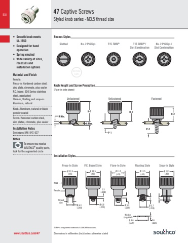 518Dimensions in millimeters (inch) unless otherwise statedPress-In Style Flare-In Style Floating Style Snap-In StyleØ 11.5(.45)FerruleKnobThreadsizeØ 6.3 (.248)Ø 11.5(.45)LØ 5.3 (.209)Ø 11.5(.45)0.6 (.025)Ø 5.7 (.224)Washer(supplied)LØ 8.6 (.339)P.C. Board StyleØ 11.5(.45)Ø 6.9 (.272)1.5(.058)LØ 11.5(.45)www.southco.com/4747 Captive ScrewsStyled knob series · M3.5 thread size• Smooth knob meets Recess StylesUL-1950 • Designed for hand operation• Spring ejected• Wide variety of sizes,recesses and installation optionsMaterial and FinishFerrule: Press-in: Hardened carbon steel, zinc plate, chromate, plus sealerP.C. board: 300 Series stainless steel, passivated Flare-in, floating and snap-in: Aluminum, naturalKnob: Aluminum, natural or black powder coatedScre Hardened carbon steel, zinc plated, chromate, plus sealerInstallation NotesSee pages 546-547, 627NotesTo ensure you receive SOUTHCO® quality parts, look for the segmented circleSlotted No. 2 Phillips T15 TORX®H-2P-2P-1H-1 H-1A Min.A Max.Unfastened Unfastened FastenedT15 TORX® /Slot CombinationNo. 2 Phillips /Slot CombinationKnob Height and Screw Projection(Flare-in style shown)Installation StylesTORX® is a registered trademark of CAMCAR InnovationsACTUALSIZE