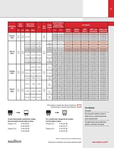 521Dimensions in millimeters (inch) unless otherwise statedInstallationStyleKnob HeightOuter Panel Dimensions B TotalFloatFlangeLengthLScrew ProjectionBeyond Outer Surface of PanelPart NumberH-1 H-2 A Min. A Max. P-1 P-2 SlottedRecessPhillipsRecessTORX®RecessTORX® / SlotCombinationPhillips / SlotCombinationPress-InStyle16.2(.64)11.3 (.45) 0.9 (.036) ~ ~ 0.8(.03) ~0.6 (.02) 5.6 (.22) 47-90-301-24 47-90-321-24 47-90-341-20 47-90-361-20 47-90-381-202.2 (.09) 7.2 (.28) 47-91-301-24 47-91-321-24 47-91-341-20 47-91-361-20 47-91-381-203.8 (.15) 8.7 (.34) 47-92-301-24 47-92-321-24 47-92-341-20 47-92-361-20 47-92-381-205.4 (.21) 10.3 (.41) 47-93-301-24 47-93-321-24 47-93-341-20 47-93-361-20 47-93-381-20Flare-InStyle15.6(.61)10.5(.41)1.5 (.058) 3.2 (.125) 0.4 (.015)0.9(.03)1.8 (.070) 1.2 (.05) 6.3 (.25) 47-80-302-14 47-80-322-14 47-80-342-10 47-80-362-10 47-80-382-103.2 (.126) 4.8 (.189) 1.6 (.062) 3.4 (.135) 2.8 (.11) 7.9 (.31) 47-80-304-14 47-80-324-14 47-80-344-10 47-80-364-10 47-80-384-104.8 (.189) 6.4 (.251) 3.2 (.125) 5 (.197) 4.4 (.17) 9.5 (.37) 47-80-306-14 47-80-326-14 47-80-346-10 47-80-366-10 47-80-386-106.4 (.251) 7.9 (.312) 4.8 (.187) 6.6 (.26) 6 (.24) 11.1 (.44) 47-80-308-14 47-80-328-14 47-80-348-10 47-80-368-10 47-80-388-101.5 (.058) 3.2 (.125) 0.4 (.015) 1.8 (.07)2.8 (.11) 7.9 (.31) 47-81-302-14 47-81-322-14 47-81-342-10 47-81-362-10 47-81-382-104.4 (.17) 9.5 (.37) 47-82-302-14 47-82-322-14 47-82-342-10 47-82-362-10 47-82-382-106 (.24) 11.1 (.44) 47-83-302-14 47-83-322-14 47-83-342-10 47-83-362-10 47-83-382-103.2 (.126) 4.8 (.189) 1.6 (.062) 3.4 (.135)4.4 (.17) 9.5 (.37) 47-81-304-14 47-81-324-14 47-81-344-10 47-81-364-10 47-81-384-106 (.24) 11.1 (.44) 47-82-304-14 47-82-324-14 47-82-344-10 47-82-364-10 47-82-384-104.8 (.189) 6.4 (.250) 3.2 (.125) 5 (.197) 6 (.24) 11.1 (.44) 47-81-306-14 47-81-326-14 47-81-346-10 47-81-366-10 47-81-386-10FloatingStyle16.2(.64)11.2(.44)~ 0.8 (.031) 2.3 (.09)2.3(.09)3.2 (.127)2.4 (.09) 7.2 (.28) 47-80-310-14 47-80-330-14 47-80-350-10 47-80-370-10 47-80-390-104 (.16) 8.8 (.35) 47-81-310-14 47-81-330-14 47-81-350-10 47-81-370-10 47-81-390-105.6 (.22) 10.4 (.41) 47-82-310-14 47-82-330-14 47-82-350-10 47-82-370-10 47-82-390-100.8 (.031) 1.6 (.063) 3.1 (.121) 4 (.158)2.4 (.09) 7.2 (.28) 47-80-311-14 47-80-331-14 47-80-351-10 47-80-371-10 47-80-391-104 (.16) 8.8 (.35) 47-81-311-14 47-81-331-14 47-81-351-10 47-81-371-10 47-81-391-105.6 (.22) 10.4 (.41) 47-82-311-14 47-82-331-14 47-82-351-10 47-82-371-10 47-82-391-101.6 (.063) 2.4 (.094) 3.9 (.153) 4.8 (.190)4 (.16) 7.2 (.28) 47-80-312-14 47-80-332-14 47-80-352-10 47-80-372-10 47-80-392-105.6 (.22) 8.8 (.35) 47-81-312-14 47-81-332-14 47-81-352-10 47-81-372-10 47-81-392-10Snap-InStyle15.7(.62)11.2(.44)0.5 (.02) 1 (.039) 2 (.079)0.9(.03)1.1 (.044)1.1 (.04) 5.6 (.22) 47-90-310-14 47-90-330-14 47-90-350-10 47-90-370-10 47-90-390-102.7 (.11) 7.2 (.28) 47-91-310-14 47-91-330-14 47-91-350-10 47-91-370-10 47-91-390-104.3 (.17) 8.8 (.35) 47-92-310-14 47-92-330-14 47-92-350-10 47-92-370-10 47-92-390-105.8 (.23) 10.4 (.41) 47-93-310-14 47-93-330-14 47-93-350-10 47-93-370-10 47-93-390-101 (.039) 1.6 (.063) 2.6 (.102) 1.7 (.068)2.7 (.11) 7.2 (.28) 47-90-312-14 47-90-332-14 47-90-352-10 47-90-372-10 47-90-392-104.3 (.17) 8.8 (.35) 47-91-312-14 47-91-332-14 47-91-352-10 47-91-372-10 47-91-392-105.9 (.23) 10.4 (.41) 47-92-312-14 47-92-332-14 47-92-352-10 47-92-372-10 47-92-392-101.6 (.063) 2.5 (.098) 3.5 (.138) 2.6 (.103)2.7 (.11) 7.2 (.28) 47-90-314-14 47-90-334-14 47-90-354-10 47-90-374-10 47-90-394-104.3 (.17) 8.8 (.35) 47-91-314-14 47-91-334-14 47-91-354-10 47-91-374-10 47-91-394-105.9 (.23) 10.4 (.41) 47-92-314-14 47-92-334-14 47-92-354-10 47-92-374-10 47-92-394-10Part numbers in shaded rows (shown in table) are fully retracting in minimum panel thicknesswww.southco.com/47Part NumberSee tableAll screw part numbers shown in table are for a natural knob finish and a knurled knobFor black finish and smooth knob options, minimums may applyTo add a black powder coated finish, change the part number from the table as shown:Change 1 to 5: 47-80-102-14 47-80-102-54Change 2 to 6: 47-80-102-24 47-80-102-64For a smooth knob, change the part number from the table as shown:Change 0 to 1: 47-90-161-20 47-90-161-21Change 4 to 5: 47-90-101-24 47-90-101-25TORX® is a registered trademark of CAMCAR Innovations