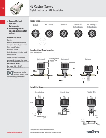 524Dimensions in millimeters (inch) unless otherwise statedPress-In Style Flare-In Style Floating StyleØ 14.7(.58)ThreadSize Ø 9.4 (.372)FerruleKnobØ 14.7(.58)LØ 8.1(.319)L0.6 (.025)Ø 8.9 (.349)Washer(supplied)Ø 11.9(.470)Ø 14.7(.58)www.southco.com/4747 Captive ScrewsStyled knob series · M6 thread size• Designed for hand operation• Spring ejected• Wide variety of sizes, recesses and installation optionsMaterial and FinishFerrule: Press-in: Hardened carbon steel, zinc plate, chromate, plus sealerFlare-in and Floating: Aluminum, naturalKnob: Aluminum, natural or black powder coatedScre Hardened carbon steel, zinc plated, chromate, plus sealerInstallation NotesSee pages 546-547, 627NotesTo ensure you receive SOUTHCO® quality parts, look for the segmented circleSlotted No. 2 Phillips T30 TORX® T30 TORX® /Slot CombinationNo. 2 Phillips /Slot CombinationH-2P-2P-1H-1 H-1A Min.A Max.Unfastened Unfastened Fastened 1 (.04) Screw projectionfor TORX® and TORX® / slotACTUALSIZERecess StylesKnob Height and Screw Projection(Flare-in style shown)Installation StylesTORX® is a registered trademark of CAMCAR Innovations