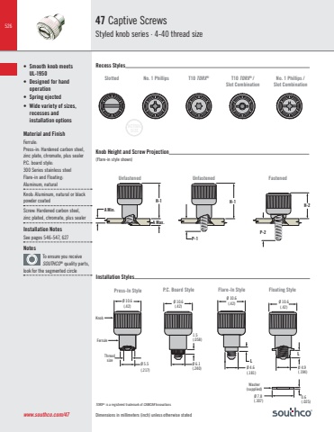 526Dimensions in millimeters (inch) unless otherwise statedPress-In Style Floating StyleØ 10.6(.42)L0.6 (.025)Ø 4.9 (.194)Washer(supplied)Ø 7.8 (.307)Ø 10.6(.42)FerruleKnobThreadsizeØ 5.5 (.217)Flare-In StyleLØ 4.6 (.181)Ø 10.6(.42)P.C. Board StyleØ 10.6(.42)Ø 6.1 (.240)1.5 (.058)www.southco.com/4747 Captive ScrewsStyled knob series · 4-40 thread size• Smooth knob meets UL-1950 • Designed for hand operation• Spring ejected• Wide variety of sizes, recesses and installation optionsMaterial and FinishFerrule: Press-in: Hardened carbon steel, zinc plate, chromate, plus sealerP.C. board style: 300 Series stainless steel Flare-in and Floating: Aluminum, naturalKnob: Aluminum, natural or black powder coatedScre Hardened carbon steel, zinc plated, chromate, plus sealerInstallation NotesSee pages 546-547, 627NotesTo ensure you receive SOUTHCO® quality parts, look for the segmented circleSlotted No. 1 Phillips T10 TORX®H-2P-2P-1H-1 H-1A Min.A Max.Unfastened Unfastened FastenedT10 TORX® /Slot CombinationNo. 1 Phillips /Slot CombinationRecess StylesKnob Height and Screw Projection(Flare-in style shown)Installation StylesTORX® is a registered trademark of CAMCAR InnovationsACTUALSIZE