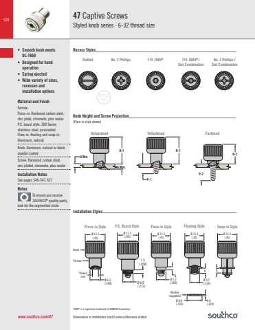 528Dimensions in millimeters (inch) unless otherwise statedPress-In Style Flare-In Style Floating Style Snap-In StyleØ 11.5(.45)FerruleKnobThreadsizeØ 6.3 (.248)Ø 11.5(.45)LØ 5.3 (.209)Ø 11.5(.45)0.6 (.025)Ø 5.7 (.224)Washer(supplied)LØ 8.6 (.339)P.C. Board StyleØ 11.5(.45)Ø 6.9 (.272)1.5(.058)LØ 11.5(.45)www.southco.com/4747 Captive ScrewsStyled knob series · 6-32 thread size• Smooth knob meets UL-1950• Designed for hand operation• Spring ejected• Wide variety of sizes, recesses and installation optionsMaterial and FinishFerrule: Press-in: Hardened carbon steel, zinc plate, chromate, plus sealerP.C. board style: 300 Series stainless steel, passivated Flare-in, floating and snap-in: Aluminum, naturalKnob: Aluminum, natural or black powder coatedScre Hardened carbon steel, zinc plated, chromate, plus sealerInstallation NotesSee pages 546-547, 627NotesTo ensure you receive SOUTHCO® quality parts, look for the segmented circleSlotted No. 2 Phillips T15 TORX®H-2P-2P-1H-1 H-1A Min.A Max.Unfastened Unfastened FastenedT15 TORX® /Slot CombinationNo. 2 Phillips /Slot CombinationACTUALSIZERecess StylesKnob Height and Screw Projection(Flare-in style shown)Installation StylesTORX® is a registered trademark of CAMCAR Innovations