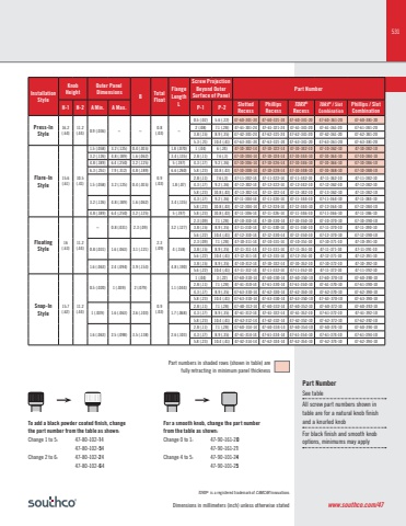 531Dimensions in millimeters (inch) unless otherwise statedInstallationStyleKnob HeightOuter Panel Dimensions B TotalFloatFlangeLengthLScrew ProjectionBeyond Outer Surface of PanelPart NumberH-1 H-2 A Min. A Max. P-1 P-2 SlottedRecessPhillipsRecessTORX®RecessTORX® / SlotCombinationPhillips / SlotCombinationPress-InStyle16.2(.64)11.2 (.44) 0.9 (.036) ~ ~ 0.8(.03) ~0.5 (.02) 5.6 (.22) 47-60-301-24 47-60-321-24 47-60-341-20 47-60-361-20 47-60-381-202 (.08) 7.1 (.28) 47-61-301-24 47-61-321-24 47-61-341-20 47-61-361-20 47-61-381-203.8 (.15) 8.9 (.35) 47-62-301-24 47-62-321-24 47-62-341-20 47-62-361-20 47-62-381-205.3 (.21) 10.4 (.41) 47-63-301-24 47-63-321-24 47-63-341-20 47-63-361-20 47-63-381-20Flare-InStyle15.6(.61)10.5(.41)1.5 (.058) 3.2 (.125) 0.4 (.015)0.9(.03)1.8 (.070) 1 (.04) 6 (.24) 47-10-302-14 47-10-322-14 47-10-342-10 47-10-362-10 47-10-382-103.2 (.126) 4.8 (.189) 1.6 (.062) 3.4 (.135) 2.8 (.11) 7.6 (.3) 47-10-304-14 47-10-324-14 47-10-344-10 47-10-364-10 47-10-384-104.8 (.189) 6.4 (.250) 3.2 (.125) 5 (.197) 4.3 (.17) 9.2 (.36) 47-10-306-14 47-10-326-14 47-10-346-10 47-10-366-10 47-10-386-106.3 (.251) 7.9 (.312) 4.8 (.189) 6.6 (.260) 5.8 (.23) 10.8 (.43) 47-10-308-14 47-10-328-14 47-10-348-10 47-10-368-10 47-10-388-101.5 (.058) 3.2 (.125) 0.4 (.015) 1.8 (.07)2.8 (.11) 7.6 (.3) 47-11-302-14 47-11-322-14 47-11-342-10 47-11-362-10 47-11-382-104.3 (.17) 9.2 (.36) 47-12-302-14 47-12-322-14 47-12-342-10 47-12-362-10 47-12-382-105.8 (.23) 10.8 (.43) 47-13-302-14 47-13-322-14 47-13-342-10 47-13-362-10 47-13-382-103.2 (.126) 4.8 (.189) 1.6 (.062) 3.4 (.135) 4.3 (.17) 9.2 (.36) 47-11-304-14 47-11-324-14 47-11-344-10 47-11-364-10 47-11-384-105.8 (.23) 10.8 (.43) 47-12-304-14 47-12-324-14 47-12-344-10 47-12-364-10 47-12-384-104.8 (.189) 6.4 (.250) 3.2 (.125) 5 (.197) 5.8 (.23) 10.8 (.43) 47-11-306-14 47-11-326-14 47-11-346-10 47-11-366-10 47-11-386-10FloatingStyle16(.63)11.2(.44)~ 0.8 (.031) 2.3 (.09)2.3(.09)3.2 (.127)2.3 (.09) 7.1 (.28) 47-10-310-14 47-10-330-14 47-10-350-10 47-10-370-10 47-10-390-103.8 (.15) 8.9 (.35) 47-11-310-14 47-11-330-14 47-11-350-10 47-11-370-10 47-11-390-105.6 (.22) 10.4 (.41) 47-12-310-14 47-12-330-14 47-12-350-10 47-12-370-10 47-12-390-100.8 (.031) 1.6 (.063) 3.1 (.121) 4 (.158)2.3 (.09) 7.1 (.28) 47-10-311-14 47-10-331-14 47-10-351-10 47-10-371-10 47-10-391-103.8 (.15) 8.9 (.35) 47-11-311-14 47-11-331-14 47-11-351-10 47-11-371-10 47-11-391-105.6 (.22) 10.4 (.41) 47-12-311-14 47-12-331-14 47-12-351-10 47-12-371-10 47-12-391-101.6 (.063) 2.4 (.094) 3.9 (.153) 4.8 (.190) 3.8 (.15) 8.9 (.35) 47-10-312-14 47-10-332-14 47-10-352-10 47-10-372-10 47-10-392-105.6 (.22) 10.4 (.41) 47-11-312-14 47-11-332-14 47-11-352-10 47-11-372-10 47-11-392-10Snap-InStyle15.7(.62)11.2(.44)0.5 (.020) 1 (.039) 2 (.079)0.9(.03)1.1 (.044)1 (.04) 3 (.22) 47-60-310-14 47-60-330-14 47-60-350-10 47-60-370-10 47-60-390-102.8 (.11) 7.1 (.28) 47-61-310-14 47-61-330-14 47-61-350-10 47-61-370-10 47-61-390-104.3 (.17) 8.9 (.35) 47-63-310-14 47-62-330-14 47-62-350-10 47-62-370-10 47-62-390-105.8 (.23) 10.4 (.41) 47-63-310-14 47-63-330-14 47-63-350-10 47-63-370-10 47-63-390-101 (.039) 1.6 (.063) 2.6 (.103) 1.7 (.068)2.8 (.11) 7.1 (.28) 47-60-312-14 47-60-332-14 47-60-352-10 47-60-372-10 47-60-392-104.3 (.17) 8.9 (.35) 47-61-312-14 47-61-332-14 47-61-352-10 47-61-372-10 47-61-392-105.8 (.23) 10.4 (.41) 47-62-312-14 47-62-332-14 47-62-352-10 47-62-372-10 47-62-392-101.6 (.063) 2.5 (.098) 3.5 (.138) 2.6 (.103)2.8 (.11) 7.1 (.28) 47-60-314-14 47-60-334-14 47-60-354-10 47-60-374-10 47-60-394-104.3 (.17) 8.9 (.35) 47-61-314-14 47-61-334-14 47-61-354-10 47-61-374-10 47-61-394-105.8 (.23) 10.4 (.41) 47-62-314-14 47-62-334-14 47-62-354-10 47-62-374-10 47-62-394-10TORX® is a registered trademark of CAMCAR InnovationsPart numbers in shaded rows (shown in table) are fully retracting in minimum panel thicknessPart NumberSee tableAll screw part numbers shown in table are for a natural knob finish and a knurled knobFor black finish and smooth knob options, minimums may applyTo add a black powder coated finish, change the part number from the table as shown:Change 1 to 5: 47-80-102-14 47-80-102-54Change 2 to 6: 47-80-102-24 47-80-102-64For a smooth knob, change the part number from the table as shown:Change 0 to 1: 47-90-161-20 47-90-161-21Change 4 to 5: 47-90-101-24 47-90-101-25www.southco.com/47