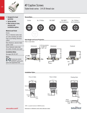 534Dimensions in millimeters (inch) unless otherwise statedPress-In Style Flare-In Style Floating StyleØ 14.7(.58)ThreadSize Ø 9.4 (.372)FerruleKnobØ 14.7(.58)LØ 8.1(.319)L0.6 (.025)Ø 8.9 (.349)Washer(supplied)Ø 11.9(.470)Ø 14.7(.58)www.southco.com/4747 Captive ScrewsStyled knob series · 1/4-20 thread size• Designed for hand operation• Spring ejected• Wide variety of sizes, recesses and installation optionsMaterial and FinishFerrule: Press-in: Hardened carbon steel, zinc plate, chromate, plus sealerFlare-in and Floating: Aluminum, naturalKnob: Aluminum, natural or black powder coatedScre Hardened carbon steel, zinc plated, chromate, plus sealerInstallation NotesSee pages 546-547, 627NotesTo ensure you receive SOUTHCO® quality parts, look for the segmented circleH-2P-2P-1H-1 H-1A Min.A Max.Unfastened Unfastened Fastened 1 (.04) Screw projectionfor TORX® and TORX® / slotACTUALSIZERecess StylesKnob Height and Screw Projection(Flare-in style shown)Installation StylesSlotted No. 2 Phillips T30 TORX® T30 TORX® /Slot CombinationNo. 2 Phillips /Slot CombinationTORX® is a registered trademark of CAMCAR Innovations