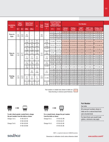 535Dimensions in millimeters (inch) unless otherwise statedInstallationStyleKnob HeightOuter Panel Dimensions B TotalFloatFlangeLengthLScrew ProjectionBeyond Outer Surface of PanelPart NumberH-1 H-2 A Min. A Max. P-1 P-2 SlottedRecessPhillipsRecessTORX®RecessTORX® / SlotCombinationPhillips / SlotCombinationPress-InStyle20(.79)13.4(.53)0.9 (.036) ~ ~ 0.8(.03) ~0.5 (.02) 7.1 (.28) 47-60-601-24 47-60-621-24 47-60-641-20 47-60-661-20 47-60-681-202.1 (.08) 8.7 (.34) 47-61-601-24 47-61-621-24 47-61-641-20 47-61-661-20 47-61-681-203.7 (.15) 10.3 (.41) 47-62-601-24 47-62-621-24 47-62-641-20 47-62-661-20 47-62-681-205.3 (.21) 11.9(.47) 47-63-601-24 47-63-621-24 47-63-641-20 47-63-661-20 47-63-681-20Flare-InStyle19.3(.76)12.7(.50)1.5 (.058)3.2 (.125)0.4 (.015)0.9(.03)1.8 (.070) 1.2 (.05) 7.8 (.31) 47-10-602-14 47-10-622-14 47-10-642-10 47-10-662-10 47-10-682-103.2 (.126)4.8 (.189)1.6 (.062)3.4 (.135) 2.8 (.11) 9.4 (.37) 47-10-604-14 47-10-624-14 47-10-644-10 47-10-664-10 47-10-684-104.8 (.188)6.4 (.250)3.2 (.125)5 (.197) 4.4 (.17) 11 (.43) 47-10-606-14 47-10-626-14 47-10-646-10 47-10-666-10 47-10-686-106.4 (.251)7.9 (.312)4.8 (.189)6.6 (.260) 6 (.24) 12.6 (.50) 47-10-608-14 47-10-628-14 47-10-648-10 47-10-668-10 47-10-688-101.5 (.058)3.2 (.125)0.4 (.015)1.8 (.070)2.8 (.11) 9.4 (.37) 47-11-602-14 47-11-622-14 47-11-642-10 47-11-662-10 47-11-682-104.4 (.17) 11 (.43) 47-12-602-14 47-12-622-14 47-12-642-10 47-12-662-10 47-12-682-106 (.24) 12.6 (.50) 47-13-602-14 47-13-622-14 47-13-642-10 47-13-662-10 47-13-682-103.2 (.126)4.8 (.189)1.6 (.062)3.4 (.135)4.4 (.17) 11 (.43) 47-11-604-14 47-11-624-14 47-11-644-10 47-11-664-10 47-11-684-106 (.24) 12.6 (.50) 47-12-604-14 47-12-624-14 47-12-644-10 47-12-664-10 47-12-684-104.8 (.189)6.4 (.250)3.2 (.125)5 (.197) 6 (.24) 12.6 (.50) 47-11-606-14 47-11-626-14 47-11-646-10 47-11-666-10 47-11-686-10FloatingStyle20(.79)13.3(.52)~ 0.8 (.031)2.3 (.090)2.3(.09)3.2 (.127)2.1 (.08) 8.8 (.35) 47-10-610-14 47-10-630-14 47-10-650-10 47-10-670-10 47-10-690-103.7 (.15) 10.4 (.41) 47-11-610-14 47-11-630-14 47-11-650-10 47-11-670-10 47-11-690-105.3 (.21) 12 (.47) 47-12-610-14 47-12-630-14 47-12-650-10 47-12-670-10 47-12-690-100.8 (.031) 1.6 (.063)3.1 (.122) 4 (.158)2.1 (.08) 8.8 (.35) 47-10-611-14 47-10-631-14 47-10-651-10 47-10-671-10 47-10-691-103.7 (.15) 10.4 (.41) 47-11-611-14 47-11-631-14 47-11-651-10 47-11-671-10 47-11-691-105.3 (.21) 12 (.47) 47-12-611-14 47-12-631-14 47-12-651-10 47-12-671-10 47-12-691-101.6 (.063)2.4 (.094)3.9 (.153)4.8 (.190)3.7 (.15) 10.4 (.41) 47-10-612-14 47-10-632-14 47-10-652-10 47-10-672-10 47-10-692-105.3 (.21) 12 (.47) 47-11-610-14 47-11-632-14 47-11-652-10 47-11-672-10 47-11-692-10TORX® is a registered trademark of CAMCAR InnovationsPart numbers in shaded rows (shown in table) are fully retracting in minimum panel thicknessPart NumberSee tableAll screw part numbers shown in table are for a natural knob finish and a knurled knobFor black finish and smooth knob options, minimums may applyTo add a black powder coated finish, change the part number from the table as shown:Change 1 to 5: 47-80-102-14 47-80-102-54Change 2 to 6: 47-80-102-24 47-80-102-64For a smooth knob, change the part number from the table as shown:Change 0 to 1: 47-90-161-20 47-90-161-21Change 4 to 5: 47-90-101-24 47-90-101-25www.southco.com/47