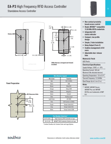 51Dimensions in millimeters (inch) unless otherwise stated• Non-contact proximity based access control• Reads MIFARE ® compatible 13.56 MHz RFID credentials• Integrated LED status indicator• Compact, low profi le design• Simple, 3 hole installation• Relay Output (Form C)• Enables management of 64 users• Adjustable door release timeMaterial & FinishABS PlasticElectrical Specifi cationsSupply Voltage: 12VDC +/- 10%Operating Current: 160 mA Maximum (No attached devices)Operating Temperature: -15 to 55 0CTransmit Frequency: 13.56 MHzRead Range: Up to 5 cm (2 in.)Notes** MIFARE, MIFARE Classic, MIFARE Plus and MIFAREDESFire are trademarks of NXP B.V. EA-P3 High Frequency RFID Access ControllerStandalone Access ControllerWire Harness LegendWire Color FunctionRed VCC (12VDC)Black GNDBrown Relay N.OOrange Relay COMYellow Relay N.C.Green UnusedBlue Auxiliary InputLight Green LED GNDPink LED Control (+12VDC)Purple Tamper Switch N.C.Gray Tamper Switch N.O.White Tamper Switch COMPart Number Selection*EA-P3-200-1 High Frequency RFID Controller w/ LogoEA-C3-101 MIFARE® RFID Credential; Slotted, w/o LogoPanel Preparation* Contact Southco for Custom Color and Logo Optionswww.southco.com/EA11.1(.44)94(3.7)42.8 (1.69) 15.1 (.59)3.1 (.12)Ø 6.5(.26)3.1 (.24)70.7(2.78)Ø 10(.39) 32.5(1.28)6.1 (.24)6.1 (.24)32.5(1.28)70.7(2.78)11.1(.44)94(3.7)42.8 (1.69) 15.1 (.59)3.1 (.12)Ø 6.5(.26)3.1 (.24)70.7(2.78)Ø 10(.39) 32.5(1.28)6.1 (.24)6.1 (.24)32.5(1.28)70.7(2.78) 300m Harness (stripped and tinned) installedM3 Clearance HoleACTUAL SIZEStatus LED
