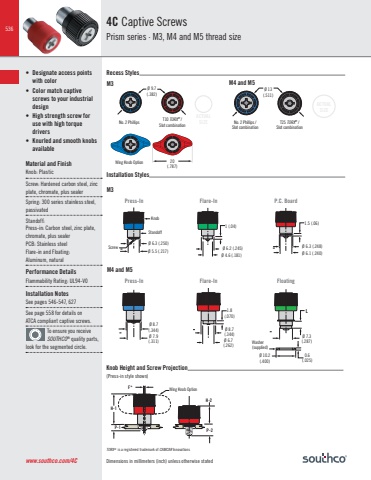 536Dimensions in millimeters (inch) unless otherwise statedM3Press-InPress-InFlare-InFlare-InP.C. BoardFloatingM4 and M5M3M4 and M5Ø 9.7(.382)20(.787)No. 2 Phillips / Slot combinationT25 TORX® /Slot combinationØ 13(.511)Ø 5.5 (.217)Ø 6.3 (.250)Ø 4.6 (.181)1 (.04)Ø 6.2 (.245) Ø 6.1 (.240)1.5 (.06)Ø 6.3 (.248)Ø 7.9(.311)Ø 8.7(.344)Ø 6.7(.262)Ø 8.7(.344)1.8(.070)Ø 7.3(.287)L0.6(.025)Ø 10.2(.400)Recess StylesInstallation StylesKnob Height and Screw Projection(Press-in style shown)• Designate access pointswith color• Color match captivescrews to your industrialdesign• High strength screw foruse with high torquedrivers• Knurled and smooth knobsavailableMaterial and FinishKnob: PlasticScre Hardened carbon steel, zinc plate, chromate, plus sealerSpring: 300 series stainless steel, passivatedStandoff: Press-in: Carbon steel, zinc plate, chromate, plus sealerPCB: Stainless steelFlare-in and Floating: Aluminum, naturalPerformance DetailsFlammability Rating: UL94-V0Installation NotesSee pages 546-547, 627See page 558 for details onATCA compliant captive screws.To ensure you receive SOUTHCO® quality parts, look for the segmented circle.4C Captive ScrewsPrism series · M3, M4 and M5 thread sizewww.southco.com/4CTORX® is a registered trademark of CAMCAR InnovationsP-1F*H-1H-2P-2No. 2 PhillipsWing Knob OptionKnobScrewStandoffWasher(supplied)No. 2 Phillips /Slot combinationT10 TORX® /Slot combination T25 TORX® /Slot combinationWing Knob OptionACTUALSIZEACTUALSIZE