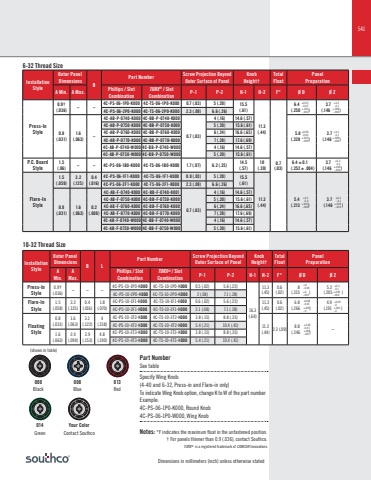 541Dimensions in millimeters (inch) unless otherwise stated6-32 Thread SizeInstallationStyleOuter Panel DimensionsBPart Number Screw Projection Beyond Outer Surface of PanelKnob Height†TotalFloatPanel PreparationA Min. A Max. Phillips / SlotCombinationTORX® / SlotCombination P-1 P-2 H-1 H-2 F* Ø D Ø ZPress-InStyle0.9† (.036) ~ ~ 4C-PS-06-1P0-K000 4C-TS-06-1P0-K000 0.7 (.03) 5 (.20) 15.5(.61)11.3(.44)0.7(.03) 6.4 (.250 ) 3.7 (.146 ) 4C-PS-06-2P0-K000 4C-TS-06-2P0-K000 2.3 (.09) 6.6 (.26)0.8 (.031)1.6 (.063) ~ 4C-AB-P-0740-K000 4C-BB-P-0740-K000 0.7 (.03)4 (.16) 14.6 (.57) 5.8 (.228 ) 3.7 (.146 ) 4C-AB-P-0750-K000 4C-BB-P-0750-K000 5 (.20) 15.6 (.61) 4C-AB-P-0760-K000 4C-BB-P-0760-K000 6 (.24) 16.6 (.65) 4C-AB-P-0770-K000 4C-BB-P-0770-K000 7 (.28) 17.6 (.69) 4C-AB-P-0740-W000 4C-BB-P-0740-W000 4 (.16) 14.6 (.57) 4C-AB-P-0750-W000 4C-BB-P-0750-W000 5 (.20) 15.6 (.61)P.C. BoardStyle1.5 (.06) ~ ~ 4C-PS-06-1B0-K000 4C-TS-06-1B0-K000 1.7 (.07) 6.2 (.25) 14.5(.57)10 (.39) 6.4 ± 0.1 (.252 ± .004) 3.7 (.146 )Flare-InStyle1.5 (.059)3.2 (.125)0.4 (.016)4C-PS-06-1F1-K000 4C-TS-06-1F1-K000 0.8 (.03) 5 (.20) 15.5(.61)11.3(.44) 5.4 (.213 ) 3.7 (.146 )4C-PS-06-2F1-K000 4C-TS-06-2F1-K000 2.3 (.09) 6.6 (.26)0.8 (.031)1.6 (.063)0.2 (.008) 4C-AB-F-0740-K000 4C-BB-F-0740-K001 0.7 (.03)4 (.16) 14.6 (.57) 4C-AB-F-0750-K000 4C-BB-F-0750-K000 5 (.20) 15.6 (.61) 4C-AB-F-0760-K000 4C-BB-F-0760-K000 6 (.24) 16.6 (.65) 4C-AB-F-0770-K000 4C-BB-F-0770-K000 7 (.28) 17.6 (.69) 4C-AB-F-0740-W000 4C-BB-F-0740-W000 4 (.16) 14.6 (.57) 4C-AB-F-0750-W000 4C-BB-F-0750-W000 5 (.20) 15.6 (.61)(shown in table)10-32 Thread SizeInstallationStyleOuter Panel Dimensions B LPart Number Screw Projection Beyond Outer Surface of PanelKnob Height†TotalFloatPanel PreparationAMin.A Max.Phillips / SlotCombinationTORX® / SlotCombination P-1 P-2 H-1 H-2 F* Ø D Ø ZPress-InStyle0.9†(.036) ~ ~ ~ 4C-PS-10-1P0-K000 4C-TS-10-1P0-K000 0.5 (.02) 5.6 (.22)16.3 (.64)11.3(.45)0.6(.02) 8 (.315 ) 5.2 (.205 ) 4C-PS-10-2P0-K000 4C-TS-10-2P0-K000 2 (.08) 7.1 (.28)Flare-InStyle1.5 (.058)3.2 (.125)0.4 (.016)1.8 (.070)4C-PS-10-1F1-K000 4C-TS-10-1F1-K000 0.6 (.02) 5.6 (.22) 11.3(.45)0.6(.02) 6.8 (.266 ) 4.94C-PS-10-2F1-K000 (.191 ) 4C-TS-10-2F1-K000 2.1 (.08) 7.1 (.28)FloatingStyle0.8 (.031)1.6 (.063)3.1 (.122)4(.158)4C-PS-10-3T2-K000 4C-TS-10-3T2-K000 3.8 (.15) 8.8 (.35)11.2 (.44) 2.3 (.09) 8.8 (.346 ) ~ 4C-PS-10-4T2-K000 4C-TS-10-4T2-K000 5.4 (.21) 10.4 (.41)1.6 (.063)2.4 (.094)3.9 (.153)4.8 (.190)4C-PS-10-3T3-K000 4C-TS-10-3T3-K000 3.8 (.15) 8.8 (.35)4C-PS-10-4T3-K000 4C-TS-10-4T3-K000 5.4 (.21) 10.4 (.41)+0.2-0.1+.008-.004+0-0.08+0-.003+0.08-0.04+.005-.0+0.08-0.03+.003-.001+0.05-0+.002-.0Notes: *F indicates the maximum float in the unfastened position. † For panels thinner than 0.9 (.036), contact Southco.TORX® is a registered trademark of CAMCAR Innovations000Black 008Blue013Red014GreenYour ColorContact SouthcoPart Number See tableSpecify Wing Knob: (4-40 and 6-32, Press-in and Flare-in only)To indicate Wing Knob option, change K to W of the part numberExample:4C-PS-06-1P0-K000, Round Knob4C-PS-06-1P0-W000, Wing Knob+0.03-0.05+0.08-0.00+0.1-0.0+0.2-0.1+0.2-0.1+0.2-0.1+0.2-0.1+.001-.002+.003-.000+.005-.000+.008-.004+.008-.004+.008-.004+.008-.004