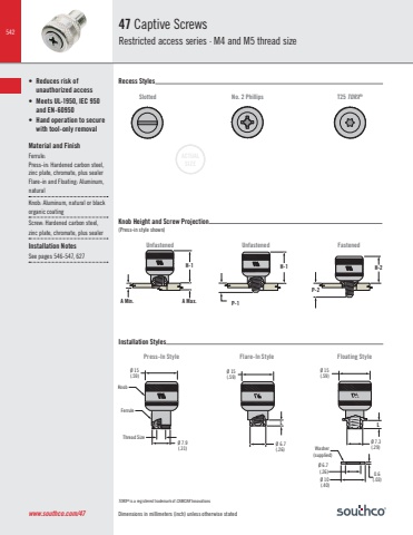 542Dimensions in millimeters (inch) unless otherwise statedPress-In Style Floating StyleL0.6(.03)Ø 7.3 Washer (.29)(supplied)Ø 6.7 (.26)Ø 15(.59)Ø 10 (.40)Ø 15(.59)Press-in StyleThread SizeØ 7.9(.31)FerruleKnobFlare-In StyleL Ø 6.7 (.26)Flare-in StyleØ 15(.59)47 Captive ScrewsRestricted access series · M4 and M5 thread size• Reduces risk ofunauthorized access• Meets UL-1950, IEC 950 and EN-60950• Hand operation to secure with tool-only removalMaterial and FinishFerrule: Press-in: Hardened carbon steel, zinc plate, chromate, plus sealer Flare-in and Floating: Aluminum, naturalKnob: Aluminum, natural or black organic coatingScre Hardened carbon steel, zinc plate, chromate, plus sealerInstallation NotesSee pages 546-547, 627Slotted No. 2 Phillips T25 TORX® H-2P-2 A Max.H-1A Min. P-1H-1 Unfastened Unfastened FastenedACTUALSIZERecess StylesInstallation StylesKnob Height and Screw Projection(Press-in style shown)TORX® is a registered trademark of CAMCAR Innovationswww.southco.com/47