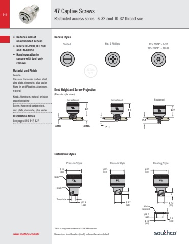 544Dimensions in millimeters (inch) unless otherwise stated47 Captive ScrewsRestricted access series · 6-32 and 10-32 thread size• Reduces risk ofunauthorized access• Meets UL-1950, IEC 950 and EN-60950• Hand operation to secure with tool-only removalMaterial and FinishFerrule: Press-in: Hardened carbon steel, zinc plate, chromate, plus sealerFlare-in and Floating: Aluminum, naturalKnob: Aluminum, natural or black organic coatingScre Hardened carbon steel, zinc plate, chromate, plus sealerInstallation NotesSee pages 546-547, 627Slotted No. 2 Phillips T15 TORX® - 6-32T25 TORX® - 10-32www.southco.com/47Knob Height and Screw Projection(Press-in style shown)Installation StylesRecess StylesACTUALSIZEPress-In Style Floating StyleL0.6(.03)Ø 7.3 (.29) Washer (supplied)Ø 6.7 (.26)Ø 15(.59)Ø 10 (.40)Ø 15(.59)Thread sizeØ 7.9(.31)FerruleKnobFlare-In StyleL Ø 6.7 (.26)Ø 15(.59)H-2P-2 A Max.H-1A Min. P-1H-1 Unfastened Unfastened FastenedTORX® is a registered trademark of CAMCAR Innovations