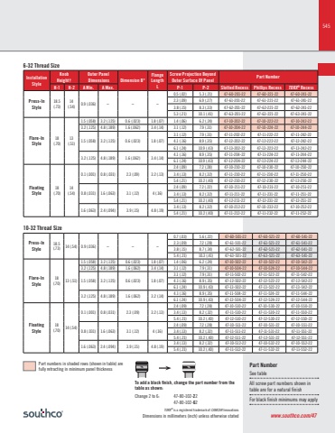 545Dimensions in millimeters (inch) unless otherwise stated www.southco.com/47Part Number See tableAll screw part numbers shown in table are for a natural finishFor black finish minimums may applyTo add a black finish, change the part number from the table as shown:Change 2 to 6: 47-80-102-22 47-80-102-62Part numbers in shaded rows (shown in table) are fully retracting in minimum panel thicknessTORX® is a registered trademark of CAMCAR InnovationsInstallationStyleKnobHeight†Outer Panel Dimensions Dimension B*FlangeLengthLScrew Projection Beyond Outer Surface Of Panel Part NumberH-1 H-2 A Min. A Max. P-1 P-2 Slotted Recess Phillips Recess TORX® RecessPress-In Style18.5 (.73)14 (.54) 0.9 (.036) ~ ~ ~0.5 (.02) 5.3 (.21) 47-60-201-22 47-60-221-22 47-60-241-22 2.3 (.09) 6.9 (.27) 47-61-201-22 47-61-221-22 47-61-241-22 3.8 (.15) 8.3 (.33) 47-62-201-22 47-62-221-22 47-62-241-22 5.3 (.21) 10.1 (.41) 47-63-201-22 47-63-221-22 47-63-241-22Flare-InStyle18 (.70)13 (.51)1.5 (.058) 3.2 (.125) 0.6 (.023) 1.8 (.07) 1.4 (.06) 6.2 (.24) 47-10-202-22 47-10-222-22 47-10-242-223.2 (.125) 4.8 (.189) 1.6 (.062) 3.4 (.14) 3.1 (.12) 7.9 (.31) 47-10-204-22 47-10-224-22 47-10-244-22 1.5 (.058) 3.2 (.125) 0.6 (.023) 1.8 (.07)3.1 (.12) 7.9 (.31) 47-11-202-22 47-11-222-22 47-11-242-224.1 (.16) 8.9 (.35) 47-12-202-22 47-12-222-22 47-12-242-22 6.1 (.24) 10.9 (.43) 47-13-202-22 47-13-222-22 47-13-242-22 3.2 (.125) 4.8 (.189) 1.6 (.062) 3.4 (.14) 4.1 (.16) 8.9 (.35) 47-11-204-22 47-11-224-22 47-11-244-22 6.1 (.24) 10.9 (.43) 47-12-204-22 47-12-224-22 47-12-244-22 FloatingStyle18 (.70)14 (.54)0.1 (.001) 0.8 (.031) 2.3 (.09) 3.2 (.13)2.4 (.09) 7.2 (.28) 47-10-210-22 47-10-230-22 47-10-250-22 3.4 (.13) 8.2 (.32) 47-11-210-22 47-11-230-22 47-11-250-22 5.4 (.21) 10.2 (.40) 47-12-210-22 47-12-230-22 47-12-250-22 0.8 (.031) 1.6 (.063) 3.1 (.12) 4 (.16)2.4 (.09) 7.2 (.22) 47-10-211-22 47-10-231-22 47-10-251-22 3.4 (.13) 8.2 (.32) 47-11-211-22 47-11-231-22 47-11-251-22 5.4 (.21) 10.2 (.40) 47-12-211-22 47-12-231-22 47-12-251-22 1.6 (.063) 2.4 (.094) 3.9 (.15) 4.8 (.19) 3.4 (.13) 8.2 (.32) 47-10-212-22 47-10-232-22 47-10-252-22 5.4 (.21) 10.2 (.40) 47-11-212-22 47-11-232-22 47-11-252-22Press-InStyle18.5 (.73) 14 (.54) 0.9 (.036) ~ ~ ~0.7 (.03) 5.6 (.22) 47-60-501-22 47-60-521-22 47-60-541-222.3 (.09) 7.2 (.28) 47-61-501-22 47-61-521-22 47-61-541-22 3.8 (.15) 8.7 (.34) 47-62-501-22 47-62-521-22 47-62-541-22 5.4 (.21) 10.3 (.41) 47-63-501-22 47-63-521-22 47-63-541-22 Flare-InStyle18 (.70) 13 (.51)1.5 (.058) 3.2 (.125) 0.6 (.023) 1.8 (.07) 1.4 (.06) 6.2 (.24) 47-10-502-22 47-10-522-22 47-10-542-223.2 (.125) 4.8 (.189) 1.6 (.062) 3.4 (.14) 3.1 (.12) 7.9 (.31) 47-10-504-22 47-10-524-22 47-10-544-22 1.5 (.058) 3.2 (.125) 0.6 (.023) 1.8 (.07)3.1 (.12) 7.9 (.31) 47-11-502-22 47-11-522-22 47-11-542-224.1 (.16) 8.9 (.35) 47-12-502-22 47-12-522-22 47-12-542-22 6.1 (.24) 10.9 (.43) 47-13-502-22 47-13-522-22 47-13-542-22 3.2 (.125) 4.8 (.189) 1.6 (.062) 3.2 (.14) 4.1 (.16) 8.9 (.35) 47-11-504-22 47-11-524-22 47-11-544-22 6.1 (.24) 10.9 (.43) 47-12-504-22 47-12-524-22 47-12-544-22 FloatingStyle18 (.70) 14 (.54)0.1 (.001) 0.8 (.031) 2.3 (.09) 3.2 (.13)2.4 (.09) 7.2 (.28) 47-10-510-22 47-10-530-22 47-10-550-22 3.4 (.13) 8.2 (.32) 47-11-510-22 47-11-530-22 47-11-550-22 5.4 (.21) 10.2 (.40) 47-12-510-22 47-12-530-22 47-12-550-22 0.8 (.031) 1.6 (.063) 3.1 (.12) 4 (.16)2.4 (.09) 7.2 (.28) 47-10-511-22 47-10-531-22 47-10-551-22 3.4 (.13) 8.2 (.32) 47-11-511-22 47-11-531-22 47-11-551-22 5.4 (.21) 10.2 (.40) 47-12-511-22 47-12-531-22 47-12-551-22 1.6 (.063) 2.4 (.094) 3.9 (.15) 4.8 (.19) 3.4 (.13) 8.2 (.32) 47-10-512-22 47-10-532-22 47-10-552-22 5.4 (.21) 10.2 (.40) 47-11-512-22 47-11-532-22 47-11-552-22 6-32 Thread Size10-32 Thread Size