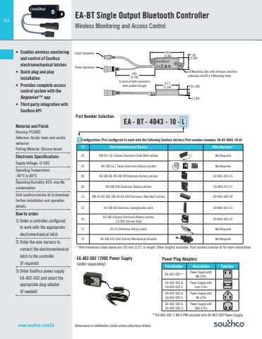 51ADimensions in millimeters (inch) unless otherwise stated83(3.26) 29(1.14)57.7(1.14) 15 (.59)1 (.03)145(5.70)EA-BT Single Output Bluetooth ControllerWireless Monitoring and Access Control• Enables wireless monitoring and control of Southco electromechanical latches• Quick plug and play installation• Provides complete access control system with the Keypanion™ app• Third party integration with Southco APIMaterial and FinishHousing: PC/ABSAdhesive: Acrylic foam and acrylic adhesivePotting Material: Silicone basedElectronic SpecificationsSupply Voltage: 12 VDCOperating Temperature:-40°C to 80°COperating Humidity: 85% max No condensationVisit southco.com/ea-bt to download further installation and operation details.How to order:1) Order a controller configured to work with the appropriate electromechanical latch2) Order the wire harness to connect the electromechanical latch to the controller(if required)3) Order Southco power supply EA-A02-002 and select the appropriate plug adapter(if needed)Latch ConnectorPower ConnectorTo back of both connectors when pulled straight2X Mounting tabs with pressure sensitive adhesive and Ø3.4 4 Mounting holesEA-A02-002 12VDC Power Supply(order separately)Power Plug AdaptersPart Number Description FunctionEA-A02-002** Power Supply withNA 2-PinEA-A02-002 &EA-A02-002-2Power Supply withEuro 2-PinEA-A02-002 &EA-A02-002-3Power Supply withUK 3-PinEA-A02-002 &EA-A02-002-4Power Supply withSAA 2-Pin**EA-A02-002-1 NA 2-PIN included with EA-A02-002 Power Supply.Part Number Selection* Wire harnesses listed above are 150 mm (5.9”) in length. Other lengths available. Visit southco.com/ea-bt for more information.EA - BT - 4043 - 10 - LL Configuration (Pre-configured to work with the following Southco latches) Part number example: EA-BT-4043-10-A1\Electromechanical Device Wire Harness*A1 EM-05-1 & 2 Series Electronic Slide Bolt Latches Not RequiredA1 R4-EM 2,6,7 Series Electronic Rotary Latches Not RequiredB1 R4-EM-9D, R4-EM-9P Electronic Rotary Latches EA-W21-A25-21B1 R4-EM-05D Electronic Rotary Latches EA-W01-A17-21C1 EM-10-XX-300, EM-10-XX-400 Electronic Slide Bolt Latches EA-W21-A03-02C1 H3-EM-60 Electronic Swinghandle Latch EA-W01-A23-21D1 R4-EM-8 Series Electronic Rotary Latches(12 VDC Version Only) EA-W24-A03-21F1 R4-25 Electronic Rotary Latch Not RequiredF2 AC-EM-102-1042 Electro-Mechanical Actuator Not Requiredwww.southco.com/EA