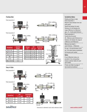547Dimensions in millimeters (inch) unless otherwise statedInstallation Notes Floating and Snap-in style:Panel preparation 1:Requires space between inner and outer panels.Specify the fastener for panel thickness A to fall between the range A Minimum to A Maximum:gap = B - A outer panel thicknessPanel preparation 2: Counter bore the panel (B = Minimum panel thickness) to a thickness (A) between the range of A Minimum and A MaximumMinimum bore depth = panel thickness - A Maximum For gap = Ø, panel thickness must be ≥ to B value (before counterbore) for the given part numberNotesB and A Maximum values are provided in the corresponding fastener selection tables for each part number If holes are drilled, top edge of hole should be chamferedØ DØ DØ CA Min. to A Max.A Min. to A Max.B MinB GapB Min A Min. to A Max.12.7 (.50)102(4.00)WasherDoorScrewsubassemblySmoothback-upsurfaceToolBGapB Min A Min. to A Max.Ø DØ CØ DA Min. to A Max.A Min. to A Max.B Min.Dull edge(punch side)Sharp edge (die side)Thread Size Tool Part NumberM3 or 4-40 47-04M3.5 or 6-32 47-06M4 or 8-32 47-08M5 47-0510-32 47-10M6 or 1/4-20 47-25Floating StyleSnap-In StylePanel preparation 1Panel preparation 1Panel preparation 2Panel preparation 2www.southco.com/47 Thread SizeØ D ( )CounterboreMin. Ø CM3 or 4-40 6.4 (.250) 9.4 (.375)M3.5 or 6-32 7.2 (.283) 10.5 (.413)M4 or 8-32 8.8 (.346) 12 (.469)M5 or 10-32 8.8 (.346) 12 (.469)M6 or 1/4-20 10.5 (.413) 13.5 (.531)+.008-0.03 +.003-.001Thread Size Ø D (± .002)CounterboreMin. Ø CM3.5 or 6-32 6.4 (.250) 7.5 (.295)M4 or 8-32 6.4 (.250) 7.5 (.295)M5 or 10-32 6.4 (.250) 7.5 (.295)+0-0.1