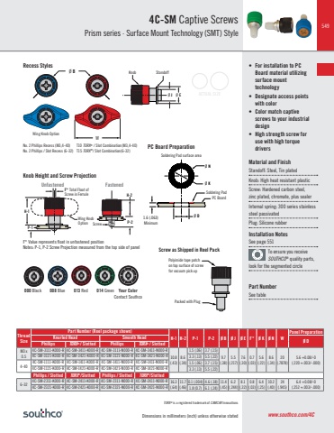 549Dimensions in millimeters (inch) unless otherwise stated1.6 (.063) Ø DØ NØ K4C-SM Captive ScrewsPrism series · Surface Mount Technology (SMT) Stylewww.southco.com/4C• For installation to PC Board material utilizing surface mount technology• Designate access points with color• Color match captive screws to your industrial design• High strength screw for use with high torque driversMaterial and FinishStandoff: Steel, Tin platedKnob: High heat resistant plastic Scre Hardened carbon steel, zinc plated, chromate, plus sealerInternal spring: 300 series stainless steel passivatedPlug: Silicone rubberInstallation NotesSee page 551To ensure you receive SOUTHCO® quality parts, look for the segmented circlePart NumberSee tableScrew as Shipped in Reel PackKnob Height and Screw ProjectionPC Board PreparationUnfastened FastenedRecess StylesF* Value represents float in unfastened positionNotes: P-1, P-2 Screw Projection measured from the top side of panelThreadSizePart Number (Reel package shown)H-1 H-2 P-1 P-2 Ø B Ø J Ø E F* Ø K Ø N WPanel PreparationKnurled Head Smooth Head Ø D Phillips TORX® / Slotted Phillips TORX® / SlottedM3 x0.54C-SM-3111-K000-R 4C-SM-3411-K000-R 4C-SM-3111-N000-R 4C-SM-3411-N000-R10.8 (.43)8.6 (.34)1.5 (.06) 3.7 (.15)9.7 (.38)5.5 (.217)7.6 (.30)0.7 (.03)5.6 (.22)8.6 (.34)20(.7878)5.6 +0.08/-0(.220 +.003/-.000)4C-SM-3121-K000-R 4C-SM-3421-K000-R 4C-SM-3121-N000-R 4C-SM-3421-N000-R 3.3 (.13) 5.5 (.22)4-404C-SM-1111-K000-R 4C-SM-1411-K000-R 4C-SM-1411-N000-R 4C-SM-1411-N000-R 1.5 (.06) 3.7 (.15)4C-SM-1121-K000-R 4C-SM-1421-K000-R 4C-SM-1421-N000-R 4C-SM-1421-N000-R 3.3 (.13) 5.5 (.22)Phillips / Slotted TORX®/Slotted Phillips / Slotted TORX®/Slotted6-32 4C-SM-2311-K000-R 4C-SM-2411-K000-R 4C-SM-2311-N000-R 4C-SM-2411-N000-R 16.3(.64)11.7(.46)0.1 (.004) 4.6 (.18) 11.4(.45)6.2(.244)8.1(.32)0.8(.03)6.4(.25)10.2(.40)24(.945)6.4 +0.08/-04C-SM-2321-K000-R 4C-SM-2421-K000-R 4C-SM-2321-N000-R 4C-SM-2421-N000-R 1.8 (0.7) 6.1 (.24) (.252 +.003/-.000)No. 2 Phillips Recess (M3,4-40)No. 2 Phillips / Slot Recess (6-32)Ø J Ø EP-1H-1H-2P-2 Wing Knob OptionSoldering PadPolyimide tape patchon top surface of screwfor vacuum pick upPacked with PlugSoldering Pad surface areaPC BoardScrew MinimumF* Total Float of Screw in FerruleT10 TORX® / Slot Combination(M3,4-40)T15 TORX® / Slot Combination(6-32)Ø BWØ J Ø EP-1H-1H-2P-2TORX® is a registered trademark of CAMCAR Innovations000 Black 008 Blue 013 Red 014 Green Your ColorContact SouthcoWing Knob OptionKnob StandoffACTUAL SIZE