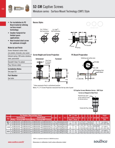 550Dimensions in millimeters (inch) unless otherwise stated52-SM Captive ScrewsMiniature series · Surface Mount Technology (SMT) StyleNo. 2 Phillips / Slot CombinationT15 TORX® / Slot CombinationØ EStandoffSpringScrewØ JG C Ø B Ø BScrew Height and Screw Projection PC Board PreparationRecess Styles* Value represents float in unfastened positionNotes: P-1, P-2 Screw Projection measured from the top side of panel52 Captive Screws Minature Series - SMT Style• For installation to PC Board material utilizing surface mount technology• Smaller footprint for limited space applications• Heat treated steel screw for optimum strengthMaterial and FinishScre Hardened carbon steel, zinc plated, chromate, plus sealer Internal spring: 300 series stainless steel, passivated Standoff: Steel, Tin platedPlug: Silicone rubberInstallation NotesSee page 551Part NumberSee tableP-1H-1 F*(Total float of screw in standoff)Unfastened FastenedP-2H-2www.southco.com/52ACTUAL SIZETORX® is a registered trademark of CAMCAR InnovationsThreadSizePart Number (Reel package shown)H-1 H-2 P-1 P-2Ø BKnurledHeadØ BSmoothHeadØ J Ø E C G F* Ø K Ø NPanel Preparation Ø DKnurled Head Smooth HeadPhillips / Slotted TORX®/Slotted Phillips / Slotted TORX®/SlottedM3 x 0.5 52-SM-3311-K-R 52-SM-3411-K-R 52-SM-3311-N-R 52-SM-3411-N-R 14(.55)9.6(.38)0.8 (.03) 5.3 (.21) 7(.28)6.8(.27)5.5(.217)7.6(.30)7(.28)2.5(.1)0.5(.02) 5.6 (.22)8.6 (.34)5.6 +0.08/-052-SM-3321-K-R 52-SM-3421-K-R 52-SM-3321-N-R 52-SM-3421-N-R 2.3 (.09) 6.8 (.27) (.220 +.003/-.000)4-4052-SM-1311-K-R 52-SM-1411-K-R 52-SM-1311-N-R 52-SM-1411-N-R 14(.55)9.6(.38)0.8 (.03) 5.3 (.21) 7(.28)6.8(.27)5.5(.217)7.6(.30)7(.28)2.5(.1)0.5(.02)5.6 +0.08/-052-SM-1321-K-R 52-SM-1421-K-R 52-SM-1321-N-R 52-SM-1421-N-R 2.3 (.09) 6.8 (.27) (.220 +.003/-.000)6-3252-SM-2311-K-R 52-SM-2411-K-R 52-SM-2311-N-R 52-SM-2411-N-R 15.7(.62)10.7(.42)0.7 (.028) 5.8 (.23) 7.9(.31)7.6(.30)6.2(.244)8.1(.32)8.1(.32)2.5(.1)0.8(.03)6.4(.25)10.2(.40)6.4 +0.08/-052-SM-2321-K-R 52-SM-2421-K-R 52-SM-2321-N-R 52-SM-2421-N-R 2.2 (.087) 7.4 (.29) (.252 +.003/-.000)Screw Spring PlugStandoff1.5 (.063) Min. Ø DØ NØ 7.9 (0.31)Ø 7.62 (0.30)Ø K15.7 (0.62)10.6(0.42)P-1P-2Soldering PadSoldering pad surface areaPC BoardPacked with PlugPolyimide tape patchon top surface of screwfor vacuum pick upScrew as Shipped in Reel Pack