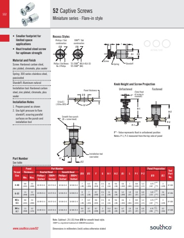 552Dimensions in millimeters (inch) unless otherwise stated52 Captive ScrewsMiniature series · Flare-in styleRecess StylesH-1P-1F*(Total float of screw in standoff)P-2 H-2Unfastened FastenedF* - Value represents float in unfastened positionNotes: P-1, P-2 measured from the top side of panel90˚ Panel thicknessØ D0.4±0.1(.016±.005)Ø Z45˚ Smooth face punch (Ø > screw head)Installation tool(see table)Note: Subtract .25 (.01) from Ø B for smooth head style.TORX® is a registered trademark of CAMCAR InnovationsKnob Height and Screw Projection• Smaller footprint forlimited space applications• Heat treated steel screwfor optimum strengthMaterial and FinishScre Hardened carbon steel, zinc plated, chromate, plus sealerSpring: 300 series stainless steel, passivated Standoff: Aluminum naturalInstallation tool: Hardened carbon steel, zinc plated, chromate, plus sealer Installation Notes1. Prepare panel as shown 2. Use light pressure to flare standoff, assuring parallel surfaces on the punch and installation toolØ EStandoff SpringScrew7Ø JØ B Ø BLTORX® / SlotcombinationPhillips / SlotcombinationPhillips / Slot RecessNo. 2 PhillipsT15 TORX® (M3,4-40,6-32)T25 TORX® (M4)GThreadSizePanel ThicknessPart NumberØ B Ø E F G H-1 H-2 Ø J L P-1 P-2Panel Preparation ToolPartNo.Knurled Head Smooth HeadØ D Ø Z Min. Max. Phillips /SlottedTORX®/SlottedPhillips / SlottedTORX®/Slotted4-40 0.8(.031)2.4(.094) 52-19-11-4 52-17-11-4 52-1A-11-4 52-18-11-4 7(.28)6.2(.245)0.5(.018)2.5(.1)14(.55)9.6(.38)4.6(.183)1(.041)0.8 (.031)5.3 (.21) 4.75 (.187 ) 3(.120) 47-1046-32 1.5(.058)3.2(.125) 52-29-21-4 52-27-21-4 52-2A-21-4 52-28-21-4 8(.31)7(.28)0.7(.028)2.5(.1)15(.59)9.6(.38)5.3(.209)1.8(.07)1.8 (.07)6.8 (.27) 5.41 (.213 )3.6(.141) 47-106M3 x0.50.8(.031)2.4(.094) 52-39-11-4 52-37-11-4 52-3A-11-4 52-38-11-4 7(.28)6.2(.245)0.6(.023)2.5(.1)14(.55)9.6(.38)4.6(.183)1(.041)0.8 (.031)5.3 (.21) 4.75 (.187 )3(.120) 47-104M4 x0.71.5(.058)3.2(.125) 52-49-21-4 52-47-21-4 52-4A-21-4 52-48-21-4 9.4(.37)8.7(.34)0.7(.028)3(.12)15.2(.60)10.1(.40)6.7(.26)1.8(.07)1.8 (.07)6.8 (.27) 6.76 (.266 )4.2(.166) 47-108ACTUAL SIZEwww.southco.com/52+0.1-0.04+.005-0+0.08-0+.003-0+0.08-0+.003-0+0.08-0+.003-0Part NumberSee table