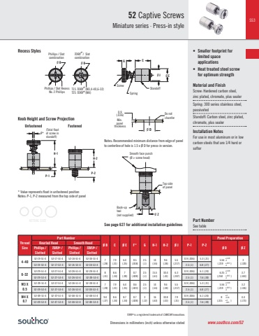 553Dimensions in millimeters (inch) unless otherwise stated52 Captive ScrewsMiniature series · Press-in styleGPhillips / Slot RecessNo. 2 PhillipsT15 TORX® (M3,4-40,6-32)T25 TORX® (M4)Phillips / SlotcombinationTORX® / SlotcombinationØ EStandoffSpringScrewØ JG C Ø B Ø BKnob Height and Screw ProjectionRecess Styles* Value represents float in unfastened positionNotes: P-1, P-2 measured from the top side of panelThreadSizePart NumberØ B C Ø E F* G H-1 H-2 Ø J P-1 P-2Panel PreparationKnurled Head Smooth HeadPhillips / Ø D Ø ZSlottedTORX® /SlottedPhillips /SlottedTORX® /Slotted4-4052-19-51-4 52-17-51-4 52-1A-51-4 52-18-51-4 7(.28)7.9(.31)6.4(.25)0.5(.018)2.5(.1)14(.55)9.6(.38)5.5(.217)0.9 (.036) 5.3 (.21) 5.56 (.219 ) 3(.120) 52-19-53-4 52-17-53-4 52-1A-53-4 52-18-53-4 2.5 (.1) 6.8 (.27)6-3252-29-51-4 52-27-51-4 52-2A-51-4 52-28-51-4 8(.31)8.6(.34)7(.28)0.7(.028)2.5(.1)15.5(.61)10.4(.41)6.3(.247)0.9 (.036) 6.1 (.24) 6.35 (.250 )3.7(.144) 52-29-53-4 52-27-53-4 52-2A-53-4 52-28-53-4 2.5 (.1) 7.6 (.30)M3 X0.552-39-51-4 52-37-51-4 52-3A-51-4 52-38-51-4 7(.28)7.9(.31)6.4(.25)0.6(.023)2.5(.1)14(.55)9.6(.38)5.5(.217)0.9 (.036) 5.3 (.21) 5.56 (.219 )3.2(.126) 52-39-53-4 52-37-53-4 52-3A-53-4 52-38-53-4 2.5 (.1) 6.8 (.27)M4 X0.752-49-51-4 52-47-51-4 52-4A-51-4 52-48-51-4 9.4(.37)8.6(.34)8.7(.34)0.7(.028)3(.12)16(.63)10.8(.43)7.9(.31)0.9 (.036) 6.1 (.24) 8 (.315 )4.4 (.173) 52-49-53-4 52-47-53-4 52-4A-53-4 52-48-53-4 2.5 (.1) 7.6 (.30)• Smaller footprint for limited space applications• Heat treated steel screw for optimum strengthMaterial and FinishScre Hardened carbon steel, zinc plated, chromate, plus sealer Spring: 300 series stainless steel, passivated Standoff: Carbon steel, zinc plated, chromate, plus sealer Installation NotesFor use in most aluminum or in low carbon steels that are 1/4 hard or softerMin. panel thicknessØ D 0.9(.036) Do not chamferBack-uptool(not supplied)Smooth face punch(Ø > screw head)Ø ZTop side of panelNotes: Recommended minimum distance from edge of panel to centerline of hole is 1.5 x Ø D for press-in version. P-1H-1 F*(Total float of screw in standoff)Unfastened FastenedP-2H-2www.southco.com/52ACTUAL SIZE+0-0.08+0.08-0+0.08-0+0.08-0+0-.003+.003-0+.003-0+.003-0See page 627 for additional installation guidelinesTORX® is a registered trademark of CAMCAR InnovationsPart NumberSee table