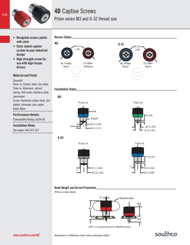 557ADimensions in millimeters (inch) unless otherwise statedM3Press-InPress-InFlare-InFlare-In6-32M36-32Ø 11.5(.45)20(.787)Ø 12.5(.48)Ø 5.5 (.217)Ø 6.3 (.250)Ø 4.6 (.181)1 (.04)Ø 6.2 (.245)Ø 6.25 (.246)Ø 7.2 (.283)Ø 5.3(.209)Ø 6.7(.263)1.8 (.07)Recess StylesInstallation StylesKnob Height and Screw Projection(Press-in style shown)• Designate access points with color• Color match captive screws to your industrial design• High strength screw for use with high torque driversMaterial and FinishStandoff: Press-in: Carbon steel, zinc plate,Flare-in: Aluminum, naturalSpring: 300 series stainless steel, passivatedScre Hardened carbon steel, zinc plated, chromate, plus sealerKnob: NylonPerformance DetailsFlammability Rating: UL94-V0Installation NotesSee pages 546-547, 6274D Captive ScrewsPrism series M3 and 6-32 thread sizewww.southco.com/4CTORX® is a registered trademark of CAMCAR InnovationsP-1H-1F*H-2P-2No. 2 Phillips RecessKnobScrewStandoffNo. 2 Phillips RecessT10 TORX® /Slot RecessT15 TORX® /RecessWing Knob OptionACTUALSIZEACTUALSIZE