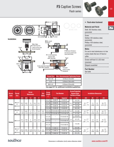 559Dimensions in millimeters (inch) unless otherwise statedF5 Captive ScrewsFlush seriesACTUAL SIZEInstallationLTØ DØ ASlot width C ShellØ BScrew• Flush when fastenedMaterial and FinishShell: 303 Stainless steel, passivatedScre Slotted: 303 stainless steel, passivated. Phillips: 430 stainless steel, passivatedNotesFor use in most aluminums or in low carbon steels that are 1/4 hard or softerScrews will float 0.5 (.02) total movementShipped assembled Part NumberSee tableM Min. panelthickness.P-1 screw projectionbeyond shellwhen retractedF Minimum thicknessfor back of panel to beflush with frame Ø HNote: Edgeof hole must besharp on this side.Do not chamferPanelØ SPanelPunchBack-uptoolP-2Screw projection beyond shell when fastenedPanelThreadedinsert or otherreceptacleFrameRecessStyleThreadSizeScrewDimensions SlotWidthScrewLengthLPart NumberScrew ProjectionBeyond Outer Surface of PanelInstallation DimensionsØ A Ø B C Ø D T Metric Imperial P-1 P-2 Ø H M F Ø SPhillipsM4 x 0.7orUNC 8-3210.1(.40)9.45(.373)3.1(.122)6.4(.25)4.3(.17) ~8.6 (.34) F5-M4-P2 F5-832-P2 4.3(.17)5.6 (.22) 9.5 (.375 )1.5(.060)3.2(.125) 9.6 (.379 )9.6 (.38) F5-M4-P4 F5-832-P4 6.6 (.26)10.6 (.42) F5-M4-P6 F5-832-P6 7.6 (.30)11.6 (.46) F5-M4-P8 F5-832-P8 8.6 (.34)SlottedM3 x 0.5orUNC 4-407.1(.28)6.45(.254)1.7(.067)4(.16)3.8(.15)0.9(.035)5.8 (.23) F5-90-402-20 F5-60-402-20 3.8(.15)4.1 (.16) 6.5 (.257 )1.3(.050)1.8(.070) 6.6 (.260 ) 7.9 (.31) F5-90-406-20 F5-60-406-20 6.1 (.24)UNC 6-32 8.1(.32)7.44(.293)2(.082)4.8(.19)3.8(.15)1(.039)6.4 (.25) ~ F5-60-602-203.8 (.15)4.3 (.17) 7.5 (.295 )1.4(.055)2.2(.085) 7.6 (.299 )6.4 (.25)8.4 (.33) ~ F5-60-606-207.4 (.29) 9.4 (.37) ~ F5-60-608-20M4 x 0.7orUNC 8-3210.1(.40)9.45(.373)2.34(.092)6.4(.25)5.1(.20)1.1(.045)8.9 (.35) F5-M40-14 F5-832-145.1(.20)6.6 (.26) 9.5 (.375 )1.5(.060)2.4(.095) 9.6 (.379 )7.6 (.30) 9.9 (.39) F5-M40-16 F5-832-1610.9 (.43) F5-M40-18 F5-832-18 8.6 (.34)Thread Size Max. Recommended Tightening TorqueM3/ 4-40 0.6 Nm (5inlbf)6-32 1.6 Nm (14inlbf)M4/ 8-32 2.8 Nm (25inlbf)www.southco.com/F5+.003-0+.003-0+.003-0+0.08-0+0.08-0+0.08-0+0.08-0+0.1-0.05+0.1-0.05+0.1-0.05+0.1-0.05+.004-.002+.004-.002+.004-.002+.004-.002+.002-.001See page 627 for additional installation guidelines