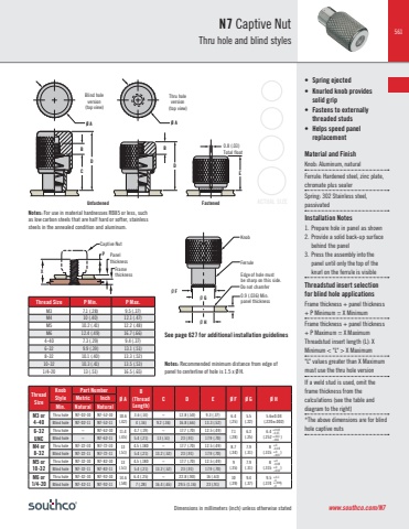 561Dimensions in millimeters (inch) unless otherwise statedN7 Captive NutThru hole and blind stylesNotes: For use in material hardnesses RB85 or less, such as low carbon steels that are half hard or softer, stainless steels in the annealed condition and aluminum.Notes: Recommended minimum distance from edge of panel to centerline of hole is 1.5 x Ø H.• Spring ejected• Knurled knob provides solid grip• Fastens to externally threaded studs• Helps speed panel replacementMaterial and FinishKnob: Aluminum, naturalFerrule: Hardened steel, zinc plate, chromate plus sealerSpring: 302 Stainless steel, passivatedInstallation Notes1. Prepare hole in panel as shown2. Provide a solid back-up surface behind the panel3. Press the assembly into the panel until only the top of the knurl on the ferrule is visibleThreadstud insert selectionfor blind hole applicationsFrame thickness + panel thickness + P Minimum = X MinimumFrame thickness + panel thickness + P Maximum = X MaximumThreadstud insert length (L): X Minimum < \\must use the thru hole versionIf a weld stud is used, omit the frame thickness from the calculations (see the table and diagram to the right)*The above dimensions are for blind hole captive nuts ThreadSizeKnob StylePart NumberØ AB(Thread Length)Metric Inch C D E Ø F Ø G Ø HMin. Natural NaturalM3 or 4-40Thru hole N7-02-10 N7-52-10 10.6 (.42)3.6 (.14) ~ 12.8 (.50) 9.3 (.37) 6.4 (.25)5.5 (.22)5.6±0.04(.220±.002) Blind hole N7-02-11 N7-52-11 4 (.16) 9.2 (.36) 16.8 (.66) 13.3 (.52)6-32UNCThru hole ~ N7-62-10 11.4 (.45)4.7 (.19) ~ 17.7 (.70) 12.5 (.49) 7.1 (.28)6.3 (.25) 6.4 Blind hole ~ N7-62-11 5.4 (.21) 13 (.51) 23 (.91) 17.9 (.70) (.252 )M4 or8-32Thru hole N7-22-10 N7-72-10 13 (.51)4.5 (.180 ~ 17.7 (.70) 12.5 (.49) 8.7 (.34)7.9 (.31) 8 Blind hole N7-22-11 N7-72-11 5.4 (.21) 13.2 (.52) 23 (.91) 17.9 (.70) (.315 )M5 or10-32Thru hole N7-32-10 N7-82-10 13 (.51)4.5 (.180 ~ 17.7 (.70) 12.5 (.49) 9 (.35)7.9 (.31) 8 Blind hole N7-32-11 N7-82-11 5.4 (.21) 13.2 (.52) 23 (.91) 17.9 (.70) (.315 )M6 or 1/4-20Thru hole N7-42-10 N7-92-10 14.6 (.58)6.4 (.25) ~ 22.8 (.90) 16 (.63) 10 (.39)9.4 (.37) 9.5 Blind hole N7-42-11 N7-92-11 7 (.28) 16.4 (.65) 29.5 (1.16) 23 (.91) (.374 )www.southco.com/N7Ø ADBlind holeversionThru holeversionUnfastened FastenedBCB 0.8 (.03)Total floatDEØ A(top view) (top view)0.9 (.036) Min. panel thicknessEdge of hole mustbe sharp on this side.Do not chamferØ HØ GØ FKnobFerrulePanel thicknessCaptive NutFrame thicknessPXACTUAL SIZEThread Size P Min. P Max.M3 7.1 (.28) 9.5 (.37)M4 10 (.40) 12.1 (.47)M5 10.2 (.41) 12.2 (.48)M6 12.4 (.49) 16.7 (.66)4-40 7.3 (.29) 9.4 (.37)6-32 9.9 (.39) 13.1 (.51)8-32 10.1 (.40) 13.3 (.52)10-32 10.3 (.41) 13.5 (.53)1/4-20 13 (.51) 16.5 (.65)+0.03-0.05+0-0.08+0-.003+.001-.002+.004-0+0-0.08+0.1-0+0-.003See page 627 for additional installation guidelines