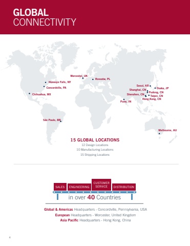 GLOBAL CONNECTIVITYHoneoye Falls, NYConcordville, PAChihuahua, MXSão Paulo, BRRzeszów, PLWorcester, UKMelbourne, AUPune, INShenzhen, CNHong Kong, CNShanghai, CNPudong, CNTaipei, CNOsaka, JPSeoul, KR15 GLOBAL LOCATIONS12 Design Locations10 Manufacturing Locations 15 Shipping Locations4Global & Americas Headquarters - Concordville, Pennsylvania, USAEuropean Headquarters - Worcester, United KingdomAsia Pacific Headquarters - Hong Kong, ChinaSALES ENGINEERING DISTRIBUTIONCUSTOMERSERVICEin over 40 Countries