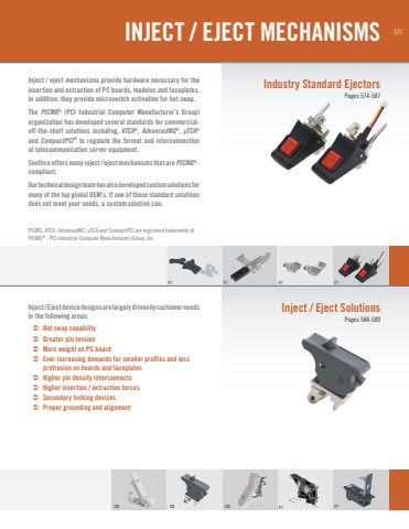 571Inject / eject mechanisms provide hardware necessary for the insertion and extraction of PC boards, modules and faceplates. In addition, they provide microswitch activation for hot swap. The PICMG® (PCI Industrial Computer Manufacturer´s Group) organization has developed several standards for commercialoff-the-shelf solutions including, ATCA®, AdvancedMC®, µTCA®and CompactPCI® to regulate the format and interconnection of telecommunication server equipment.Southco offers many inject / eject mechanisms that are PICMG®-compliant.Our technical design team has also developed custom solutions for many of the top global OEM's. If one of these standard solutions does not meet your needs, a custom solution can.Inject / Eject device designs are largely driven by customer needs in the following areas: Hot swap capability Greater pin tension More weight on PC board Ever-increasing demands for smaller profiles and less protrusion on boards and faceplates Higher pin density interconnects Higher insertion / extraction forces Secondary locking devices Proper grounding and alignmentIndustry Standard EjectorsPages 574-587P7CN CN CN P7P7 P7 P7Inject / Eject SolutionsPages 588-589INJECT / EJECT MECHANISMSP7PICMG, ATCA, AdvancedMC, µTCA and CompactPCI are registered trademarks of PICMG® - PCI Industrial Computer Manufacturers Group, Inc.