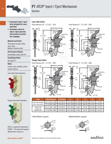 574Dimensions in millimeters (inch) unless otherwise statedACTUALSIZELever Style Switch OperationPlunger Style Switch OperationATCA is a registered trademark of PICMG® - PCI Industrial Computer Manufacturers Group, Inc.www.southco.com/P7P7 ATCA® Inject / Eject MechanismEjectors• Ergonomic inject / eject lever designed for easy operation• Secondary catch on inject / eject operates microswitch to permit hot-swapping Material and FinishSteel plated and glass-filled nylon, blackWashers: Stainless steelPerformance DetailsFlammability rating: UL94-V0Installation NotesSee page 577NotesCustom colors available, please contact SouthcoE2.5(.10)4.8(.19)Ø 4.3(.17)LeverCatchCompressionspringinternal2(.08)47.5 (1.87)B C6.1(.24)ADBlack handle2.5(.10)4.8(.19)Ø 4.3(.17)LeverCatchCompressionspringinternal2(.08)47.5 (1.87)6.1(.24)ADBECBlack handle2.5(.10)4.8(.19)Ø 4.3(.17)LeverCatchCompressionspringinternal2(.08)47.5 (1.87)6.1(.24)4.6 (.18)Black handleADBEC2.5(.10)4.8(.19)Ø 4.3(.17)LeverCatchCompressionspringinternal2(.08)47.5 (1.87)6.1(.24)4.6 (.18)Black handleADBECLever Style SwitchPanel thickness 0.8 - 1.5 (.031 - .059)Plunger Style SwitchPanel thickness 0.8 - 1.5 (.031 - .059)Panel thickness 2 - 2.5 (.078 - .098)Panel thickness 2 - 2.5 (.078 - .098)Style Panel Thickness Part Number A B C D ELever style complete with u-bent washer0.8 - 1.5 (.031 - .059) P7-A-513-11 25.2 (.99) 26.1 (1.03) 20.8 (.82) 5.4 (.21) 1.9 (.07)2 - 2.5 (.078 - .098) P7-A-523-11 26.2 (1.03) 26.1 (1.03) 20.8 (.82) 5.4 (.21) 2.9 (.11)Plunger style complete with belleville washer0.8 - 1.5 (.031 - .059) P7-A-533-11 25.2 (.99) 23 (.90) 19 (.75) 9.6 (.38) 1.9 (.07)2 - 2.5 (.078 - .098) P7-A-543-11 25.2 (.99) 23 (.90) 19 (.75) 9.6 (.38) 2.9 (.11)Ø 4.5(.18)Ø 7.8(.31)1.6(.063)Ø 4.2(.17)Ø 8(.315)0.45(.018)U-Bent Washer (supplied) Belleville Washer (supplied)