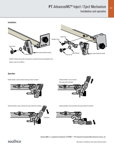 583Dimensions in millimeters (inch) unless otherwise statedP7 AdvancedMC® Inject / Eject MechanismInstallation and operationInstallationOperationAdvancedMC is a registered trademark of PICMG® - PCI Industrial Computer Manufacturers Group, Inc.Handle stowed, carrier inserted, Hot swap switch activated Handle extended, carrier inserted, Hot swap switch activatedHandle extended, carrier inserted, Hot swap switch de-activated Handle extended, carrier extracted, Hot swap switch de-activated8º RotationTap M2.5 Threads into Carrier (not shown) to accept Pivot Screw and Shoulder ScrewTighten screws to 45-60N·cmPivot ScrewPivot ScrewShoulder ScrewSwitch ArmU Bent WasherU Bent Washer Upper Handle Assembly Lower Handle Assembly