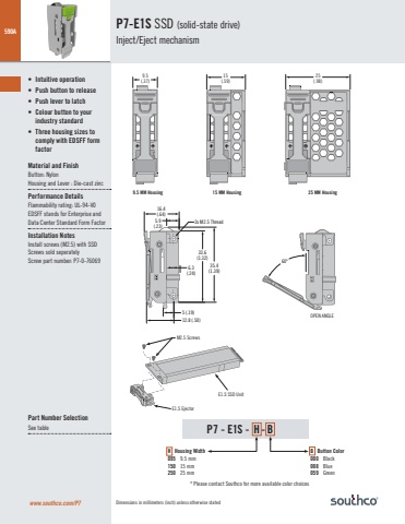 590Awww.southco.com/P7 Dimensions in millimeters (inch) unless otherwise statedP7 - E1S - H - BB Button Color000 Black 008 Blue059 GreenH Housing Width095 9.5 mm 150 15 mm250 25 mm* Please contact Southco for more available color choices25(.98)15(.59)9.5(.37)16.4(.64)2x M2.5 Thread33.6(1.32)35.4(1.39)60º5 (.19)12.8 (.50)6.3(.24)5.9(.23)OPEN ANGLE9.5 MM Housing 15 MM Housing 25 MM HousingM2.5 ScrewsE1.S SSD UnitE1.S Ejector• Intuitive operation• Push button to release• Push lever to latch• Colour button to your industry standard• Three housing sizes to comply with EDSFF form factorMaterial and FinishButton: NylonHousing and Lever : Die-cast zincPerformance DetailsFlammability rating: UL-94-V0EDSFF stands for Enterprise and Data Center Standard Form FactorInstallation NotesInstall screws (M2.5) with SSDScrews sold seperatelyScrew part number: P7-0-76069Part Number SelectionSee tableP7-E1S SSD (solid-state drive)Inject/Eject mechanism