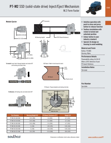 590BDimensions in millimeters (inch) unless otherwise stated13.2 (.52)10.8 (.42)1 (.039) Ø 3.8(.15) Ø 1.4 (.055)PH1.3 (.051)A5.45 (.215)4 (.157)2X 3.2(.126)2X R 1.6(.063)2X R2(.079)Ø 15.14(.596) Ø 1.8(.071)5.9(.232)5.45(.215)2.7(.106)6.7(.264)5.7(.224)P7-M2 SSD (solid-state drive) Inject/Eject Mechanism M.2 Form Factorwww.southco.com/P7Module EjectorTo Install: Insert latch through keyhole and rotate 90°until locking tab enters hole.To Remove: Lift locking tab and rotate latch 90°Part Number Housing Height (H) PC Board Thickness (P ) Height (A)P7-M2-24-160-008 2.45 (.096) 1.6 (.063) 6.7 (.263)P7-M2-24-210-008 2.45 (.096) 2.1 (.082) 6.7 (.263)P7-M2-24-240-008 2.45 (.096) 2.4 (.094) 6.7 (.263)P7-M2-50-193-008 5 (.196) 1.93 (.076) 9.24 (.363)P7-M2-50-236-008 5 (.196) 2.36 (.093) 9.24 (.363)P7-M2-66-213-008 6.6 (.259) 2.13 (.084) 10.8 (.425)• Intuitive operation with push to close and press button to release function• Toolless installation with rotate to locked and unlocked position• Colour button to your industry standard• Special rib design on housing to avoid wobblingMaterial and FinishButton: PC/ABSHousing: NylonPerformance DetailsFlammability rating: UL-94-V2Allow ±10% tolerance of your PC board thickness Installation NotesSee pagePart NumberSee tableH (Housing height)ConnectorP (PC Board thickness)PC Board: Prepare keyhole and locking tab hole.PC BoardM2 Board: Notch to lock board to latch.M2 BoardPanel cut outACTUAL SIZESection line showskeep out area