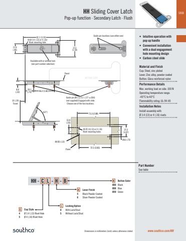 591BDimensions in millimeters (inch) unless otherwise statedACTUAL SIZEPart NumberSee tablewww.southco.com/HHHH Sliding Cover LatchPop-up function · Secondary Latch · Flush• Intuitive operation with pop up handle• Convenient installation with a dual engagement hole mounting design • Carbon steel slideMaterial and FinishCup: Steel, zinc platedLever: Zinc alloy, powder coatedButton: Glass reinforced nylonPerformance DetailsMax. working load on side: 100 NOperating temperature range: -40°C to 40°CFlammability rating: UL-94-V0Installation NotesInstall assembly withØ 3.4 (13) or 4 (.16) rivets8.4(.33)37.2(1.50)82.3 (3.24)21.9(.86)18.6 (.73)73.3 (2.88)72.5 (2.85)13.9(.55)4X R3 (.12)(63°)46.3 (1.82) 19.1(.75)27.2(1.07)HH - C L - H - BH Lever Finish5 Black Powder Coated6 Sliver Powder CoatedB Button Color000 Black008 Blue059 GreenL Locking Option0 With Lock/Stud5 Without Lock/StudC Cup Style4 Ø 3.4 (.13) Rivet Hole5 Ø 4 (.16) Rivet HolePanel4X Ø 3.4(.13) or 4 (.16)Rivet mounting holes4X Ø 3.4 (.13) or 4 (.16)Rivet mounting holeAvailable with or without lock (see part number selection)Guide pin Ø4.5 ± 0.1 (.177 ±.004)(not supplied) Engaged with slide.Choose one of the two locations.PanelGuide pin locations (use either one)10 (.39) Travel