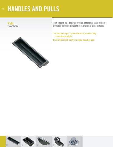 592PullsPages 594-599HANDLES AND PULLSFlush mount pull designs provide ergonomic grip without protruding hardware disrupting door, drawer, or panel surfaces. Concealed styles rotate outward to provide a fully accessible handgrip All styles install easily in a single mounting holeP2 P1 67 67 MP