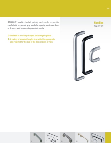 593Handles Page 600-604B8 P9 B8 B4 P8SOUTHCO® handles install quickly and easily to provide comfortable ergonomic grip points for opening enclosure doors or drawers, and for removing mounted panels. Available in a variety of styles and strength options A variety of standard lengths to provide the appropriate grip required for the size of the door, drawer, or rack