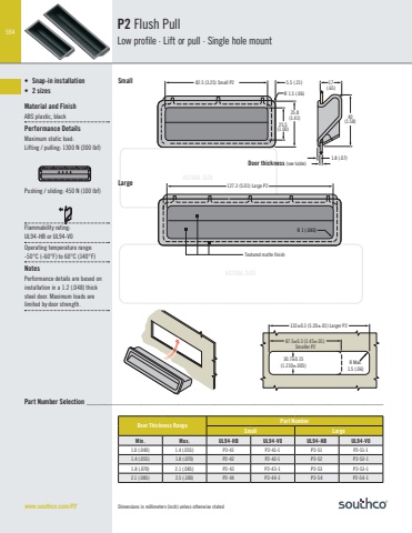 594Dimensions in millimeters (inch) unless otherwise statedACTUAL SIZEACTUAL SIZEwww.southco.com/P2Textured matte finishR 1 (.040)127.3 (5.01) Large P225.5(1.00)82.5 (3.25) Small P235.8(1.41)5.5 (.21)R 1.5 (.06)40(1.58)1.8 (.07)Door thickness (see table)17(.65)87.5±0.3 (3.45±.01) Smaller P2132±0.3 (5.20±.01) Larger P2R Max.1.5 (.06)30.7±0.15(1.210±.005)• Snap-in installation• 2 sizesMaterial and FinishABS plastic, blackPerformance DetailsMaximum static load:Lifting / pulling: 1300 N (300 lbf)Pushing / sliding: 450 N (100 lbf)Flammability rating:UL94-HB or UL94-V0Operating temperature range:-50°C (-60°F) to 60°C (140°F)NotesPerformance details are based on installation in a 1.2 (.048) thick steel door. Maximum loads are limited by door strength.P2 Flush PullLow profile · Lift or pull · Single hole mountSmallLargeDoor Thickness RangePart NumberSmall LargeMin. Max. UL94-HB UL94-V0 UL94-HB UL94-V01.0 (.040) 1.4 (.055) P2-41 P2-41-1 P2-51 P2-51-11.4 (.055) 1.8 (.070) P2-42 P2-42-1 P2-52 P2-52-11.8 (.070) 2.1 (.085) P2-43 P2-43-1 P2-53 P2-53-12.1 (.085) 2.5 (.100) P2-44 P2-44-1 P2-54 P2-54-1Part Number Selection _________________________________________________________________________________