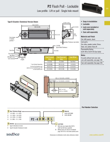 595Dimensions in millimeters (inch) unless otherwise stated www.southco.com/P2Type B (Counter-Clockwise) Version ShownP2 Flush Pull - LockableLow profile · Lift or pull · Single hole mount110 +/- 0.3 (4.33 +/-0.012)DoorFrame11 +/- 0.3 (0.433 +/-0.012)4x R 1.5(.06) 30.7 +/- 0.3(1.21 +/- 0.012)• Snap-in installation• Lockable• Lock core included orsold separately• Cam sold separatelyMaterial and FinishPull: ABS plastic, blackLock parts:Zinc alloy, powder coated. Brass. Steel, zinc plated. Buna-NFlammability RatingUL94-HB or UL94-VO (See table)NotesFor pulls without lock core, lockcore sold separately, see page 190.Cam sold separately. See page 199.Cam Forward GripCam Reversed GripCam Offset25 (0.98) 25 (0.98) No Offset21.8 (0.86) 28.2 (1.11) 3.2 (0.13)18.6 (0.73) 31.4 (1.24) 6.4 (0.25)15.5 (0.61) 34.5 (1.36) 9.5 (0.38)116.2 (4.57)Cam shownin lockedposition *82.3 (3.24)25.3 (1) 35.5 (1.4)2 (0.08)Typical Wall Thickness23 (0.91) FrameDoorCamLengthCam GripCam forwardNo Offset (Straight) CamCam reversedDoor Thickness (see table)31.85 (1.25)8.3 (0.33)38.8(1.53)* Cam Ordered SeparatelyFor Cam Part Numbers and options see our Handbook page 199 or www.southco.comP2 - 4 D M - R LL Lock Style2 With lock core, keyed alike CH751(with two flat keys supplied)9 Without lock core (See our handbook page 190-191 or visit www.southco.com)D Door Thickness Range1 1.0 (.040) - 1.4 (.055) 2 1.4 (.055) - 1.8 (.070)3 1.8 (.070) - 2.1 (.085)4 2.1 (.085) - 2.5 (.100)R Rotation1 Type A (Clockwise to lock)2 Type B (Counter-Clockwise to lock)___________________________________________________________________________ Part Number SelectionM Material1 UL94-V0 PC/ABS 2 UL94-HB ABS