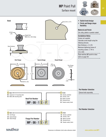597Dimensions in millimeters (inch) unless otherwise statedACTUAL SIZEKNOB OVAL SQUARE ROUNDOval flange Square flange Round flangeTapped hole M4(8-32) x 10(.4) deepKnobThru FlangeSection33(1.30)38(1.50)34(1.34)34(1.34)Ø 33(1.30)Ø 4.5 (.18)1(.04)17(.65)Ø 18.8 (.74)Ø 4.5 (.177)Door thickness• Stylish knob design• Finish and flange shape flexibilityMaterial and FinishZinc alloy, plated or powder coatedInstallation NotesScrews not supplied.Calculate screw length using the following formula: Door thickness + 6 (.25) Maximum tightening torque of mounting screws: 1.7 Nm(15 inlbf)Style matches MP push-to-close latch on page 262MP Point PullSurface mountMP - 06 - 1 S - FS Style10 Oval flange20 Square flange30 Round flangeMP - 06 - 1 S - FS Style00 Imperial 8 -32 mounting hole40 Metric M4 mounting holeKnobOval flange Square flange Round flangeTapped hole M4(8-32) x 10(.4) deepKnobThru FlangeSection33(1.30)38(1.50)34(1.34)34(1.34)Ø 33(1.30)Ø 4.5 (.18)1(.04)17(.65)Ø 18.8 (.74)Oval flange Square flange Round flangewww.southco.com/MP1___________________________________________________________________________ Part Number Selection___________________________________________________________________________ Part Number SelectionKnob Part NumberFlange Part NumberChoose knob separatelyF Finish10 Chrome, polished20 Chrome, satin30 Nickel, brushed40 Diamond brass50 Powder coated, blackF Finish10 Chrome, polished20 Chrome, satin30 Nickel, brushed40 Diamond brass50 Powder coated, black